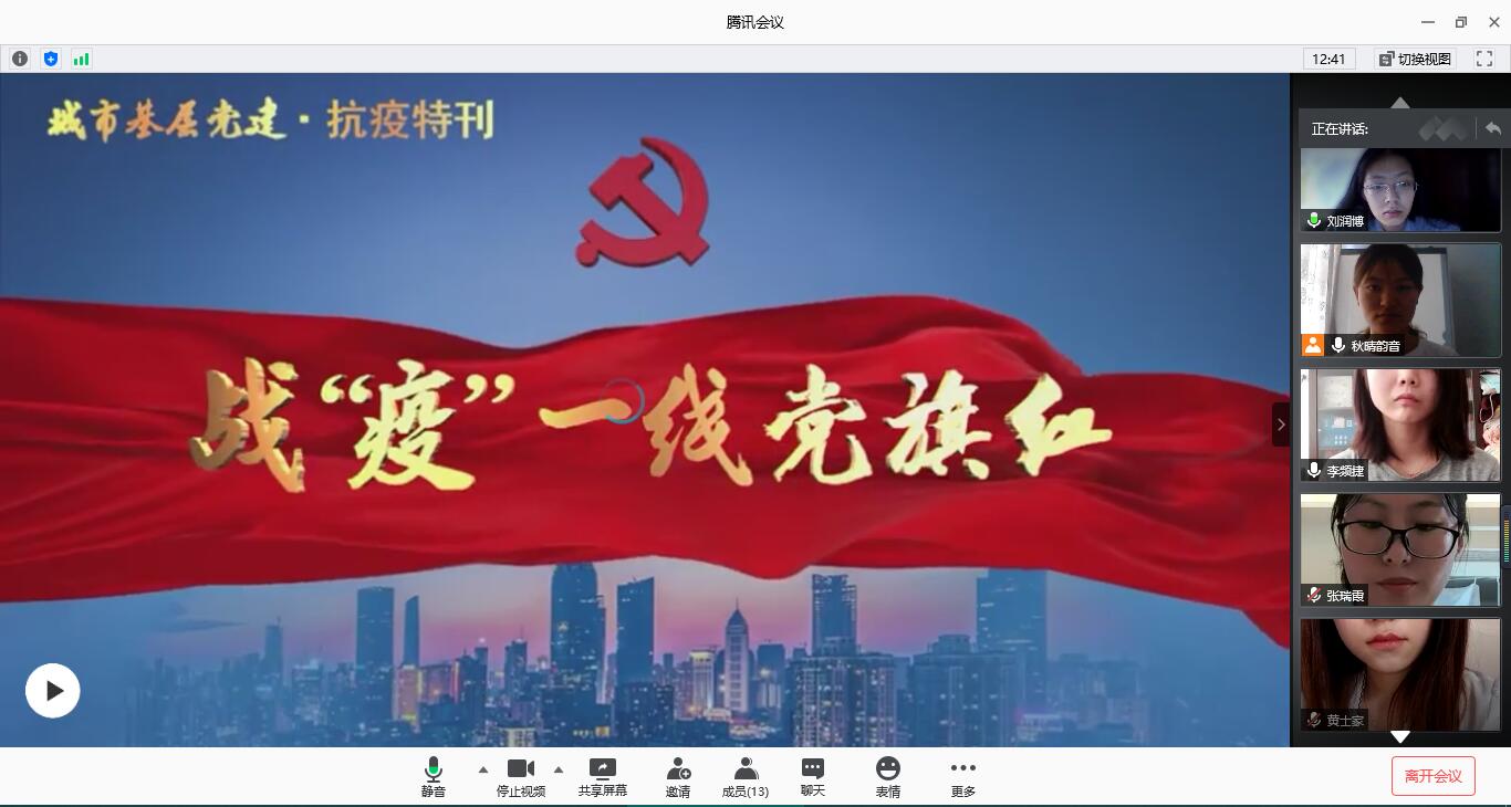 为扎实推进“牢记初新使命,争当出彩先锋”主题教育,不断升华理想信念,传承红色基因,牢记初心使命。6月28日下午,beat365官网研究生党支部组织开展《战“疫”一线党旗红》线上观影学习交流活动,支部全体党员参与会议,会议由支部副书记李频捷主持。