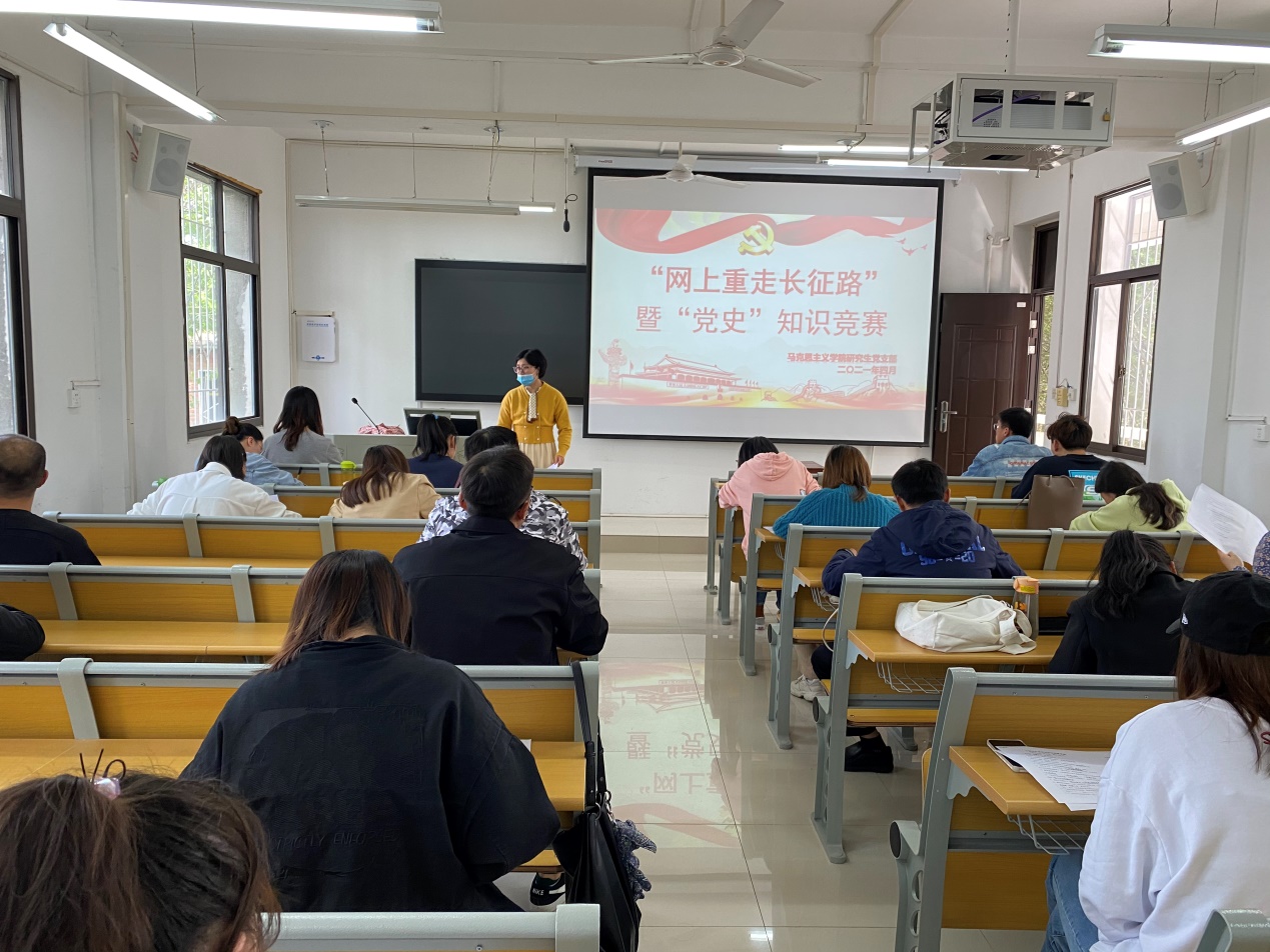 为深入贯彻落实习近平总书记在党史学习教育动员大会上的重要讲话精神,引导广大党员同志感悟百年辉煌党史,坚定理想信念。4月27日下午,在教五203教室beat365官网研究生党支部开展“网上重走长征路”暨“党史“知识竞赛答题活动,支部全体党员、入党积极分子参加此次活动,活动由支部书记郑晨霞老师主持。