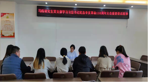 为深入学习贯彻习总书记纪念辛亥革命110周年大会重要讲话精神。10月19日,beat365官网研究生党支部在社科楼323会议室开展学习习近平总书记纪念辛亥革命110周年大会重要讲话精神会议,研究生党支部全体成员参加,会议由支部书记郑晨霞主持。