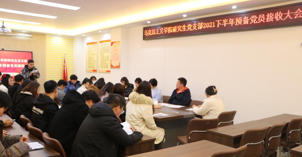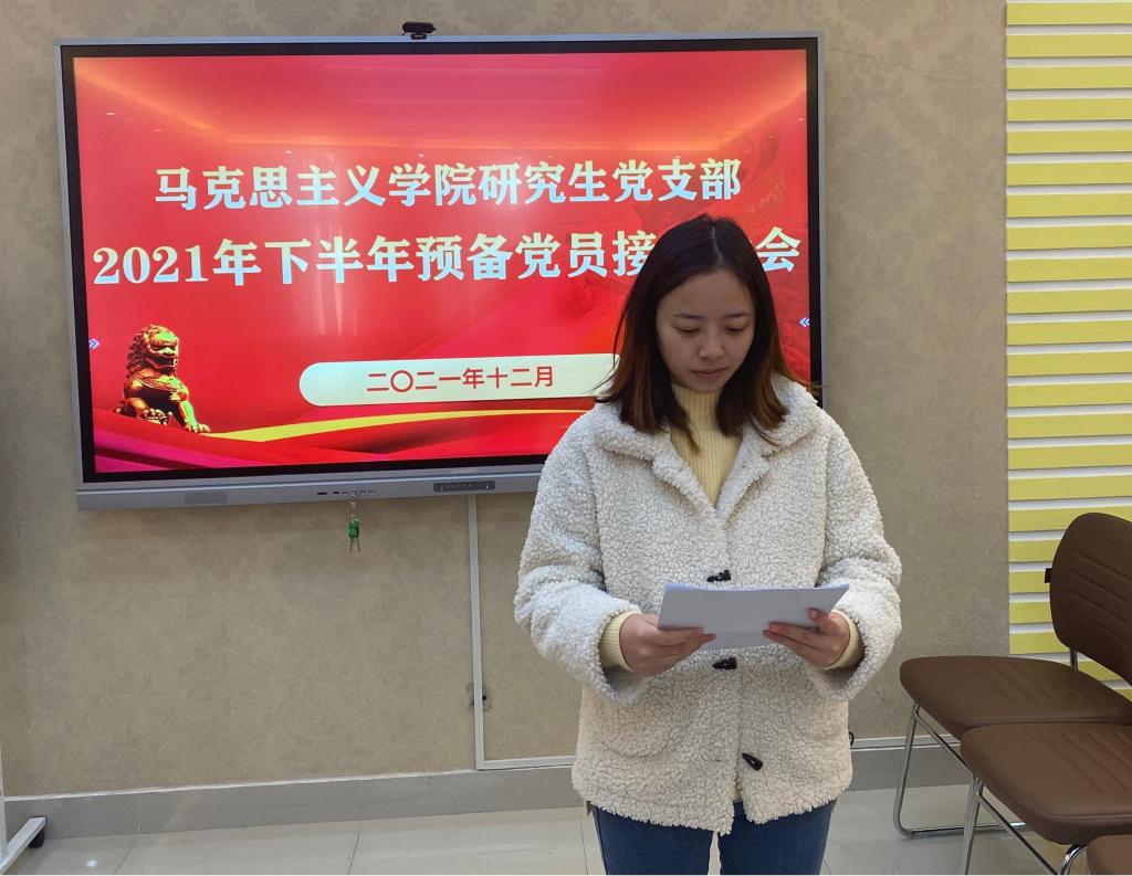 12月2日下午,beat365官网研究生党支部于社科楼323会议室召开2021下半年预备党员接收大会,讨论了王浩、李婷婷、余海玲、张丹雅、张紫鑫、周韵诗、孟祥琳、郭倩、崔浩婷、樊悦十位同志转为中共预备党员的问题。本次会议由支部书记郑晨霞主持,监票人由宣传委员李胜担任,计票人由小组长王澳远担任。