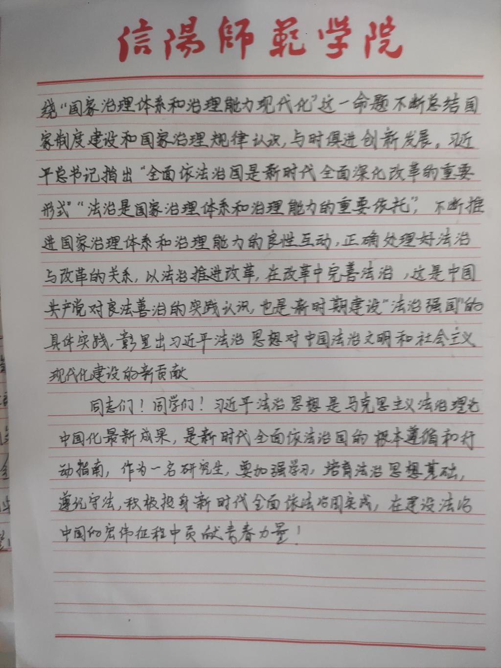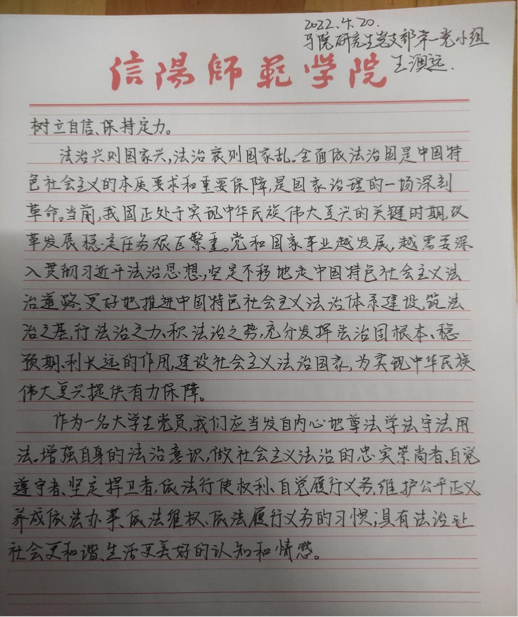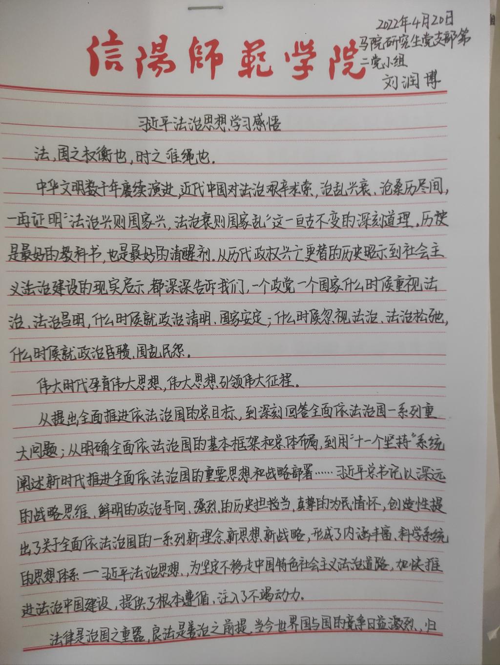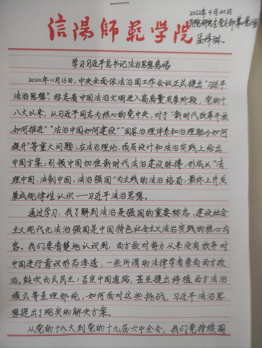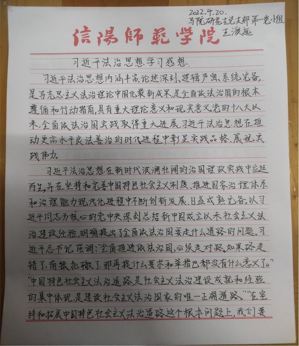 为深入学习贯彻习近平法治思想,增强beat365官网研究生党员的政治素养和法治意识,beat365官网研究生党支部开展了习近平法治思想学习交流主题党日活动。beat365官网研究生党员、预备党员及发展对象积极参与,充分运用互联网等多渠道展开学习,通过观看相关法治宣传片、系统学习习近平法治思想,进一步增强法治意识和思想觉悟。大家根据学习情况,结合自身实际,认真撰写学习习近平法治思想的心得感悟,以下为部分同志撰写的心得感悟图片。