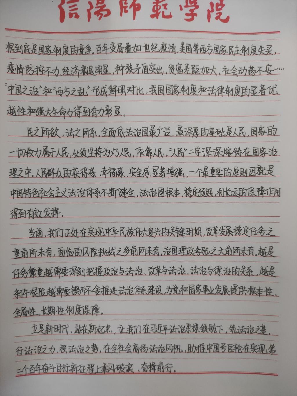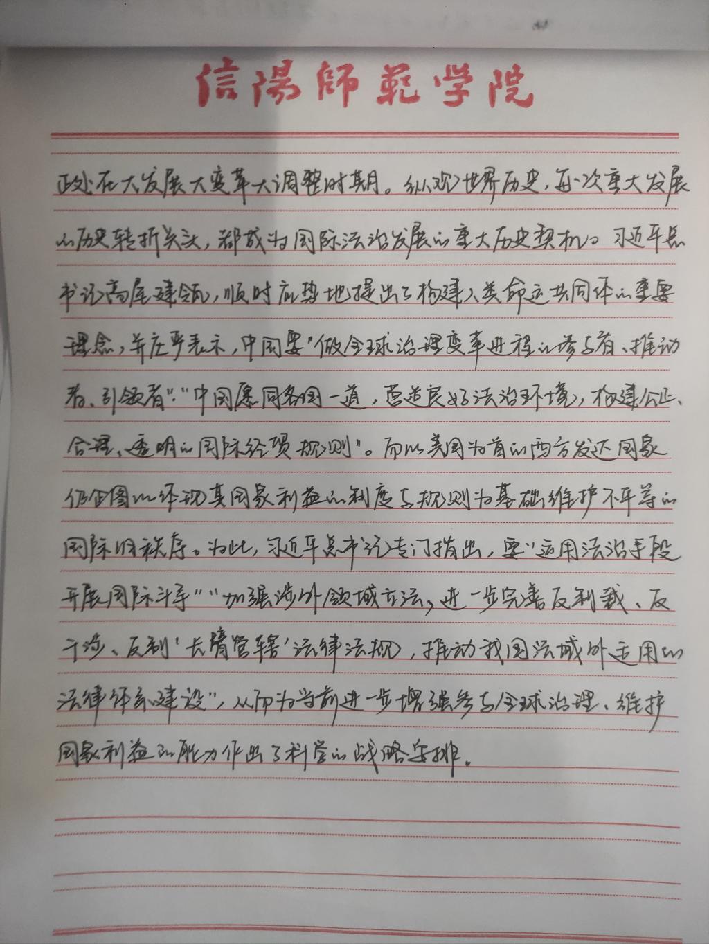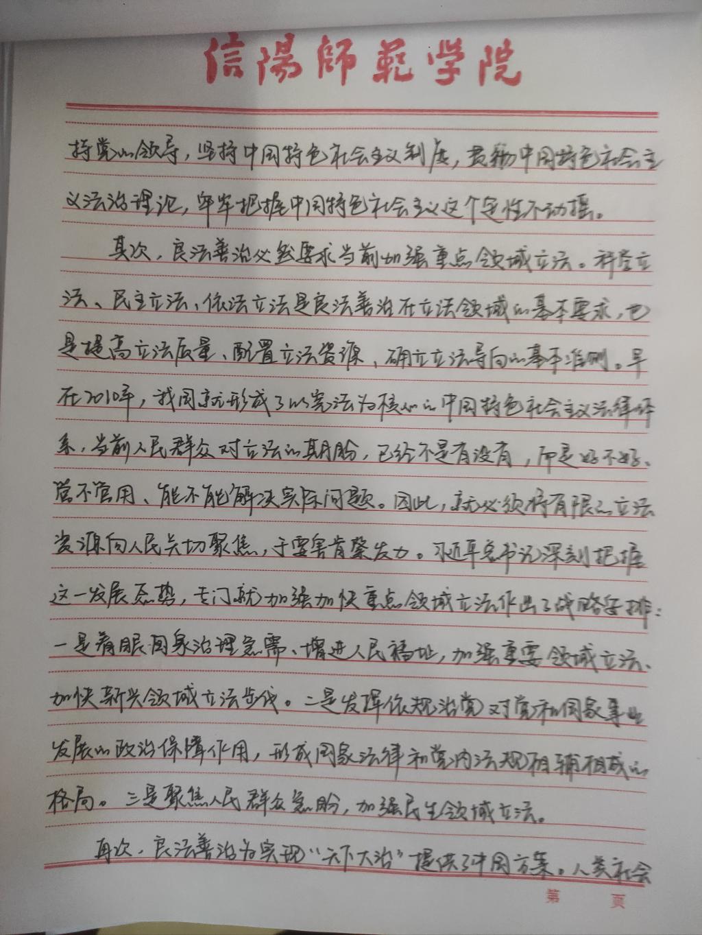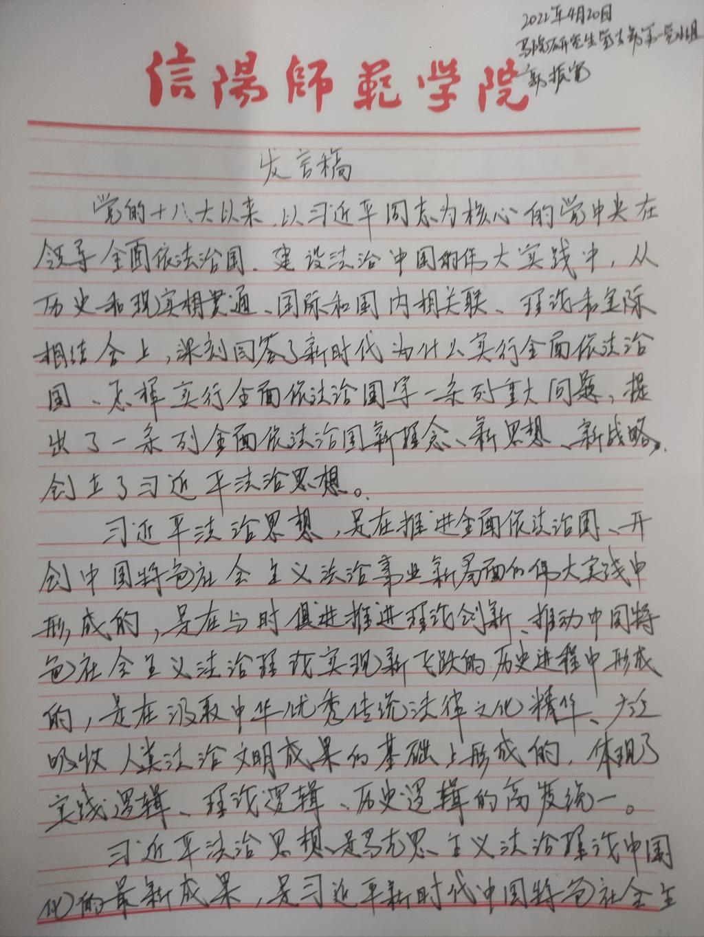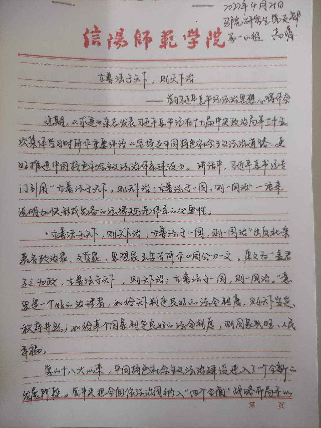 为深入学习贯彻习近平法治思想,增强beat365官网研究生党员的政治素养和法治意识,beat365官网研究生党支部开展了习近平法治思想学习交流主题党日活动。beat365官网研究生党员、预备党员及发展对象积极参与,充分运用互联网等多渠道展开学习,通过观看相关法治宣传片、系统学习习近平法治思想,进一步增强法治意识和思想觉悟。大家根据学习情况,结合自身实际,认真撰写学习习近平法治思想的心得感悟,以下为部分同志撰写的心得感悟图片。