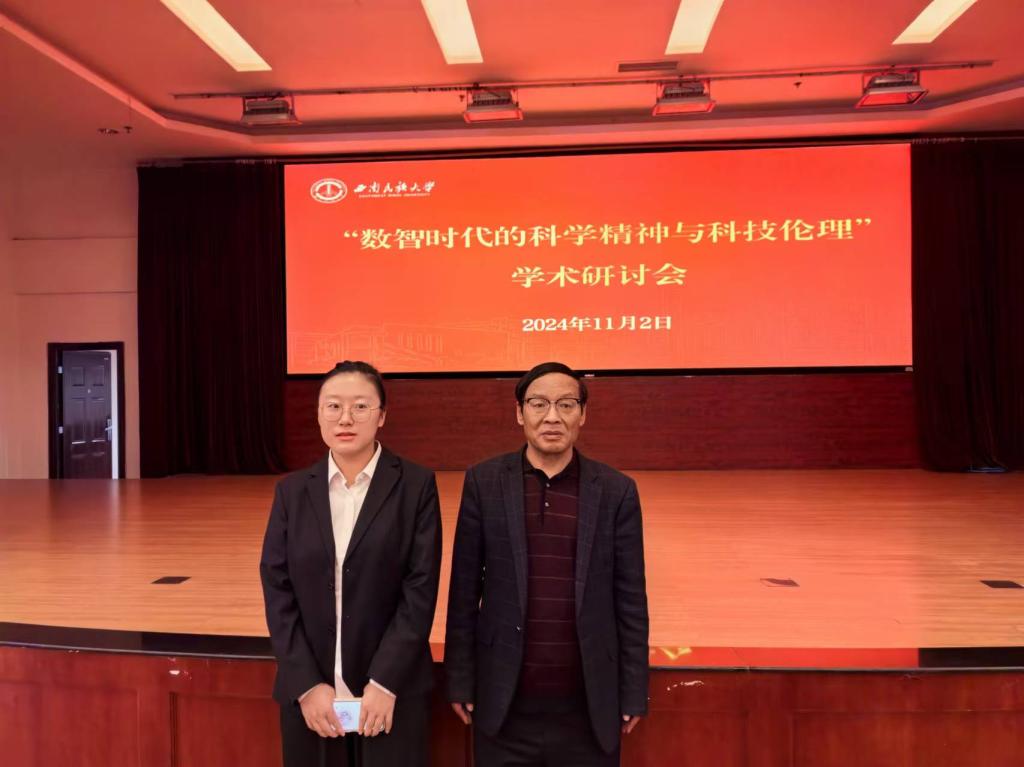 2024年11月1日-3日,“数智时代的科学精神与科技伦理”学术研讨会在西南民族大学举行。受中国自然辩证法研究会科学精神与科技伦理工作委员会以及西南民族大学beat365亚洲版官网的邀请,beat365亚洲版官网教授、河南省科学家精神宣讲团成员张铁山及其研究生赵玮嘉同学共同参加了本次学术会议。张铁山教授以“中国科学家精神谱系及其新时代科学家精神培育”为题,从科学精神、科学家精神、中国科学家精神谱系、西方科学家精神的思想源流、中国科学家精神谱系的生成和内容以及新时代科学家精神培育路径等方面作了一场精彩的具有哲理性和科学性的学术报告,得到了与会专家和学者们的好评和赞誉;研究生赵玮嘉同学以“新时代科学家精神融入初中思政课的路径探究”为题,从新时代科学家精神生成的理论和时代背景、新时代科学家精神的本质内蕴以及新时代科学家精神融入初中思政课的有效路径三个方面对新时代科学家精神的传播方法给予了分析,得到了与会专家和学者们的认可和好评。