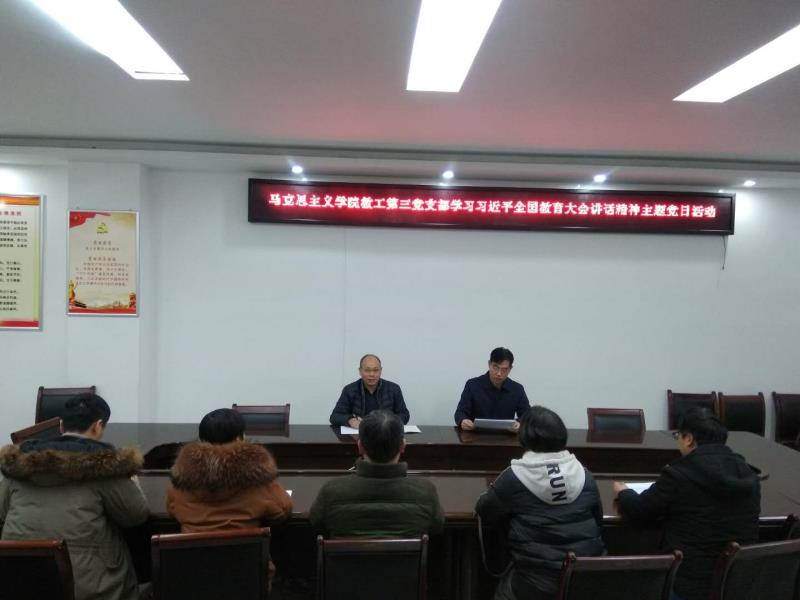 为了充分发挥教工党员的先锋模范作用,树立教工党员的良好形象,2018年12月28日下午,beat365亚洲版官网教工第三党支部在学院323会议室顺利召开“学习习近平全国教育大会讲话精神”主题党日活动。会议由支部书记厉有国同志主持。