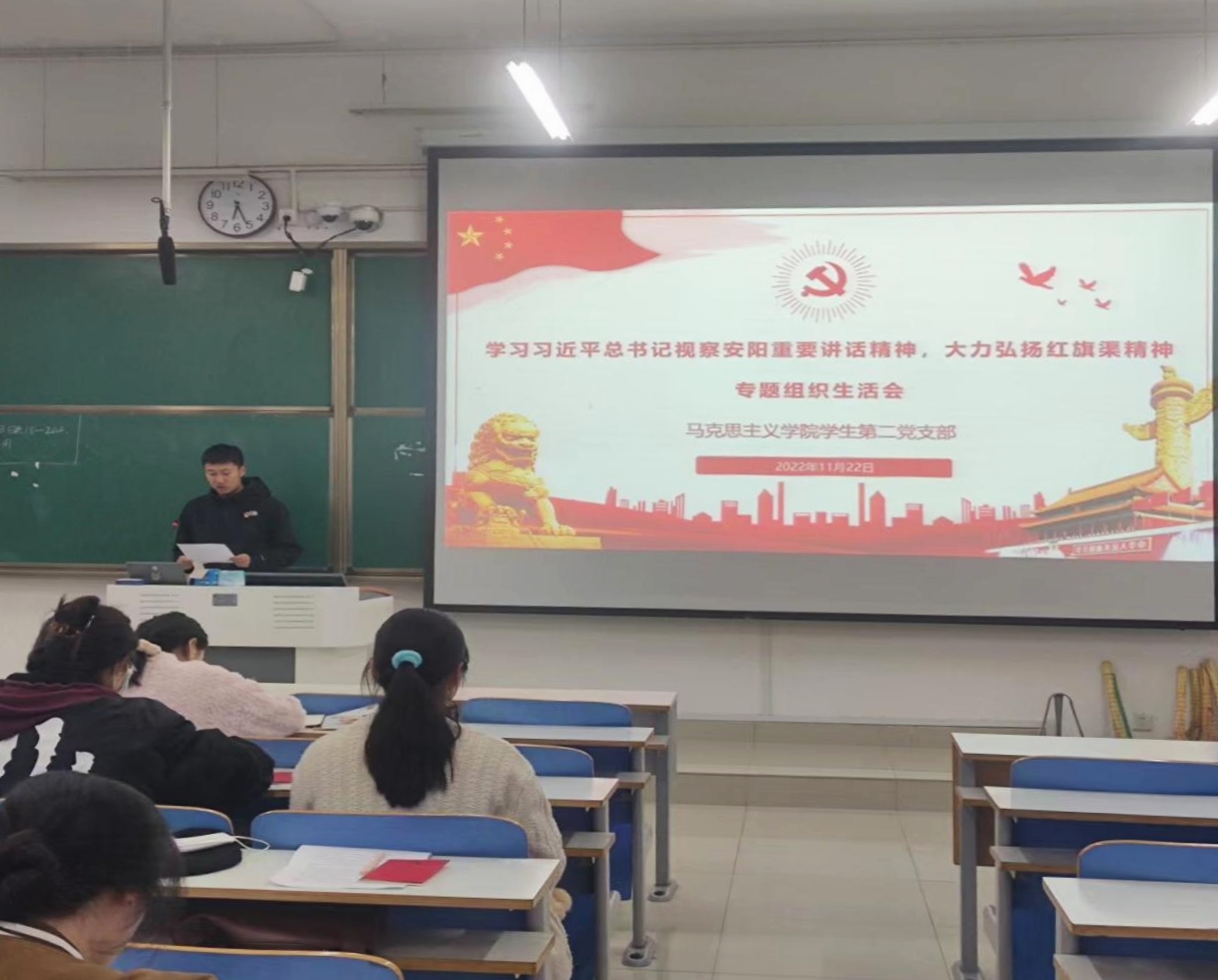 为深入学习贯彻党的二十大会议精神和习近平总书记视察河南安阳重要讲话精神,以实际行动推动高水平师范大学建设,11月22日晚上,beat365亚洲版官网学生第二党支部在社科楼414教室以“深入学习习近平总书记视察安阳重要讲话精神,大力弘扬红旗渠精神”为主题,围绕“习近平总书记视察安阳重要讲话精神”召开专题组织生活会。会议由于嘉宁同志主持。