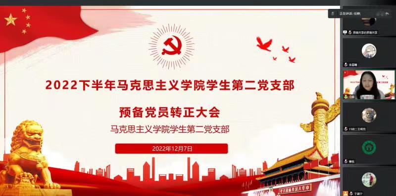 12月7日晚上,beat365亚洲版官网学生第二党支部通过腾讯会议召开2022年下半年预备党员转正大会。学院学生第二党支部正式党员曹栋、任婷、王明亮、刘鹏、宋羽潇及学生第二党支部全体预备党员参加本次会议。会议由于嘉宁同志主持。