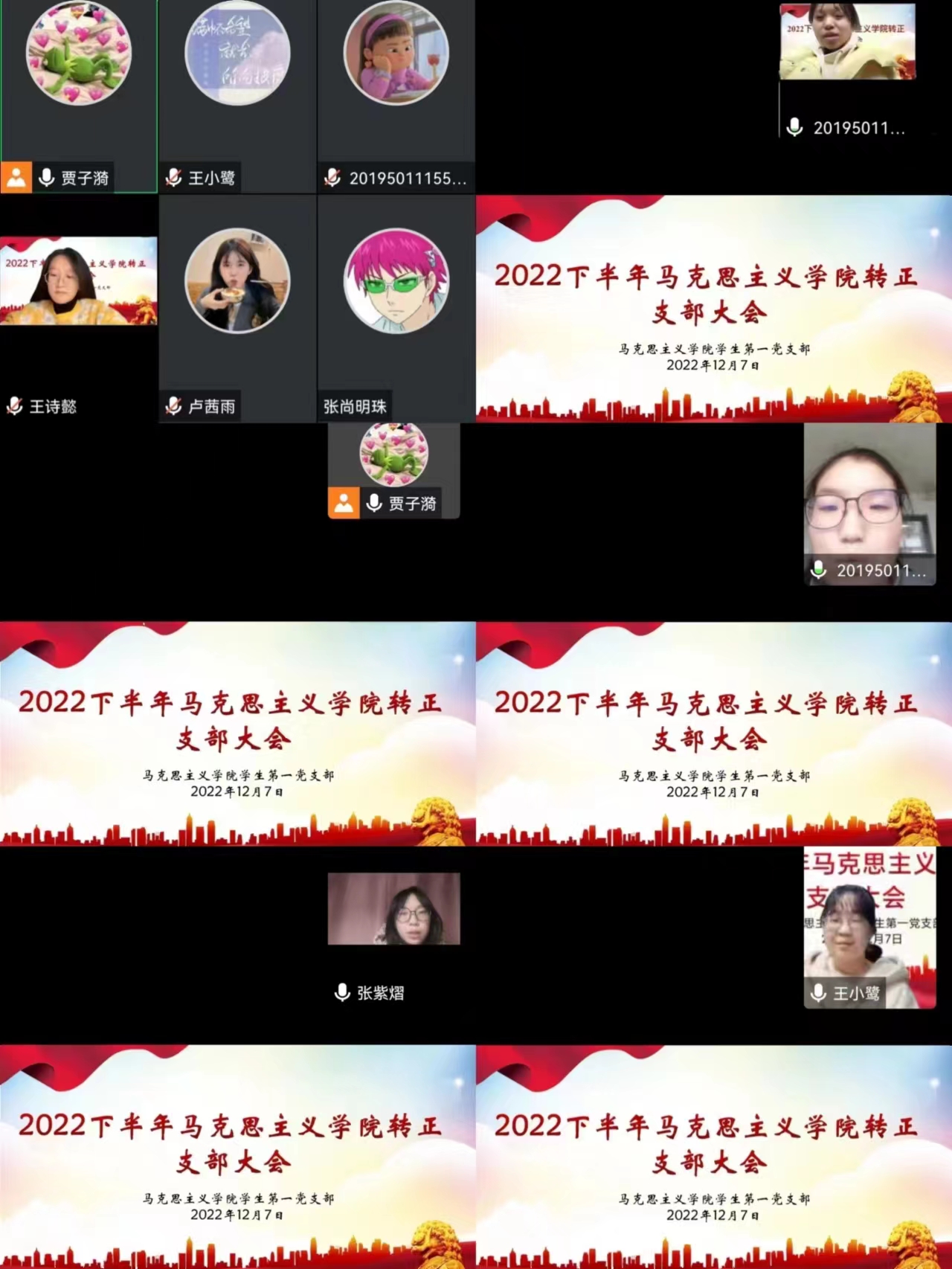 2022年12月7日下午,beat365亚洲版官网学生第一党支部在腾讯会议召开2022年上半年预备党员转正支部大会。beat365官网学生第一党支部书记高小佳,学生第一党支部正式党员、预备党员共同参加本次会议。会议由卢茜雨同志主持。