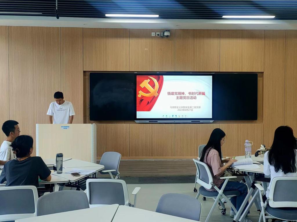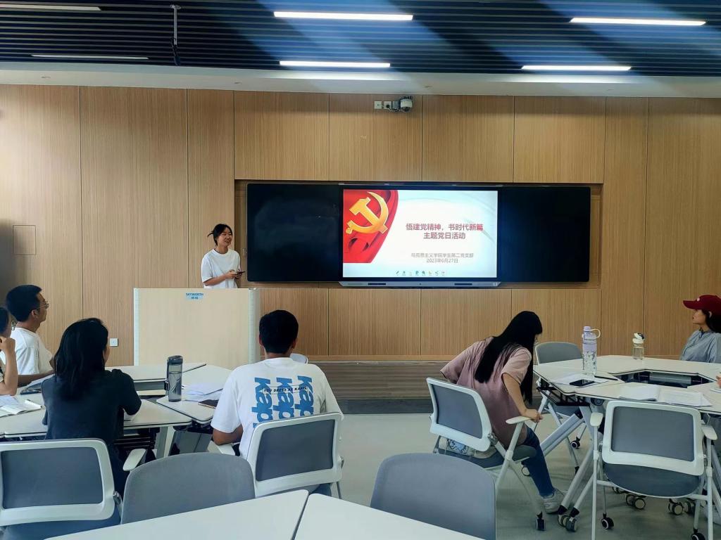 活动伊始,党支部书记任婷带领支部全体党员重温入党誓词。随后,全体党员共同观看了建党主题纪录片《重生》和《习近平治国方略——大国治理》,进一步增进了对中国共产党诞生、执政和建设的深刻认识。接着,杨璐同志、张素冰同志分别结合自身学习生活实际情况作出分享。杨璐表示,新时代赋予了青年学生更多的平台和机遇,也对我们提出了更高的要求。作为新时代大学生党员,我们要砥砺奋斗意志,拒绝“佛系”和“躺平”,为祖国建设添砖加瓦。张素冰就学习新发展理念作出分享。她表示,新发展理念具有十分重要的理论价值和实践意义,对于加强生态文明建设、实现乡村振兴“强富美”具有重要的支撑作用。最后,党支部书记任婷对本次活动作出总结。她希望各位党员进一步学习习近平新时代中国特色社会主义思想,用党的理论知识武装头脑、指导实践,在青春的赛道上奋力奔跑,努力跑出当代青年的最好成绩。