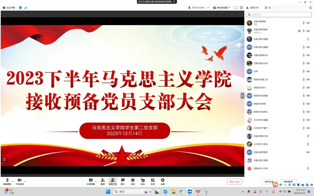 2023年12月14日下午,beat365亚洲版官网学生第二党支部在腾讯会议组织召开了2023年下半年接收预备党员支部大会。beat365官网学生第二党支部书记任婷、学生第二党支部全体正式党员、预备党员和党员发展对象共同参加本次会议。会议由任振豪同志主持。