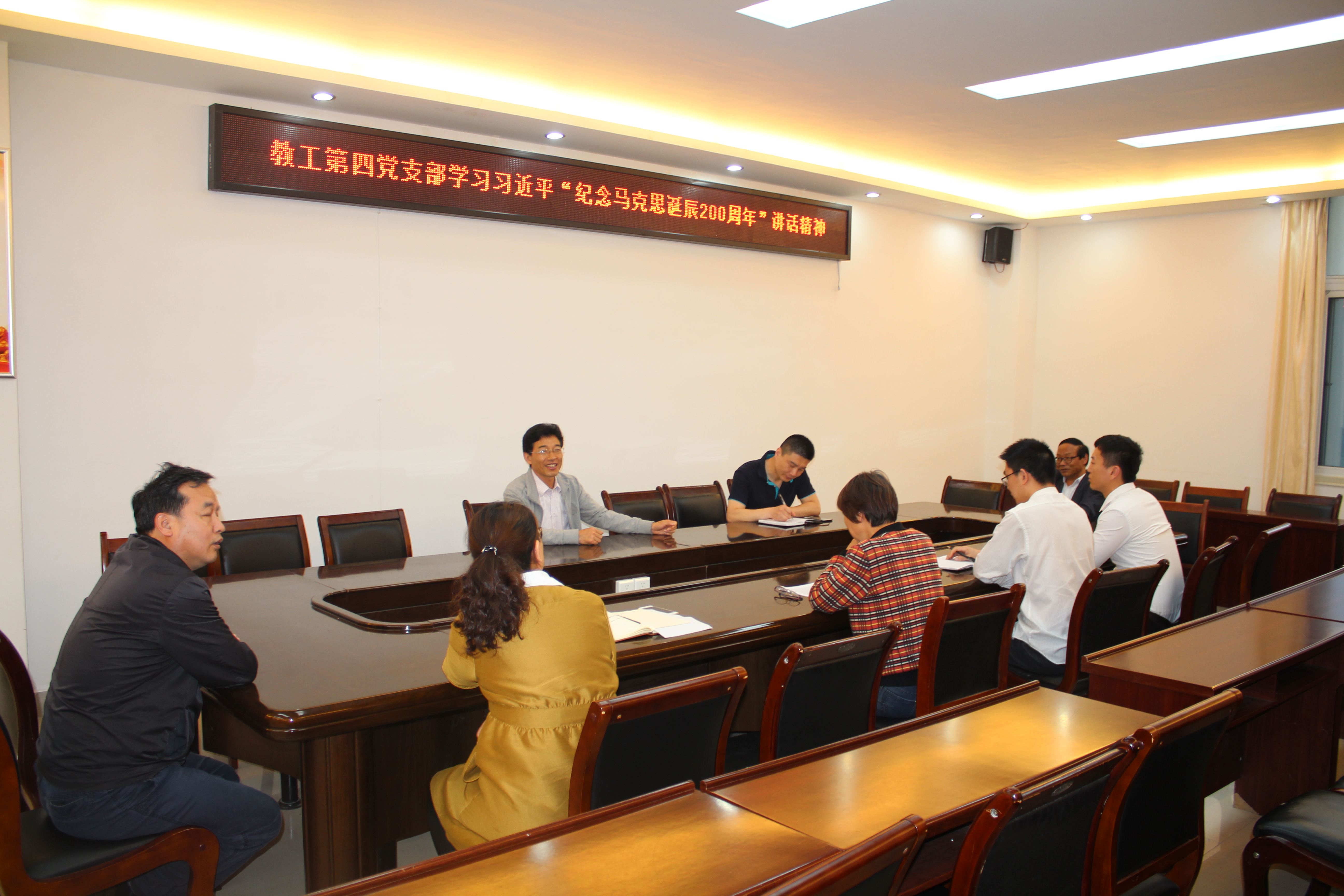 5月9日晚,教工第一党支部在支部书记王传富的带领下,在学院323会议室举行了习近平“纪念马克思诞辰200周年大会”讲话精神学习活动。学院党委书记唐国战作为支部成员参加,他从马克思的伟大理论贡献、学院教师要坚持学原著、悟原理,做到真学、真懂、真信、真用等方面进行了学习探讨,并提出,要深刻认识马克思主义理论在意识形态中的极端重要性和理论的科学性、真理性、预见性等特点,结合党的十九大精神,推动思想政治理论课“三进”工作,不仅要讲清、讲好、讲透、讲深,也要讲新,使全体师生不断增强 “四个意识”,坚定“四个自信”。