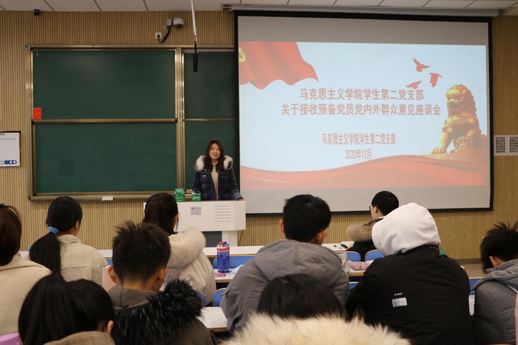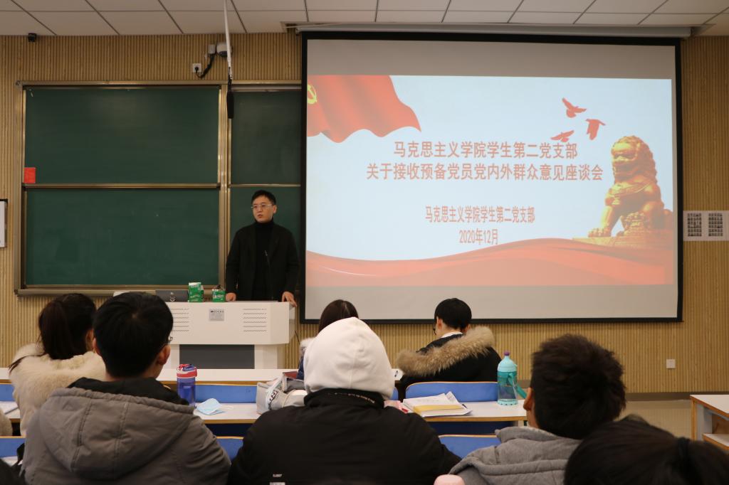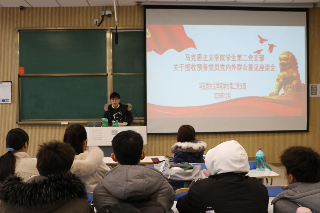 12月2日上午,beat365亚洲版官网学生第二党支部关于接收预备党员党内外群众意见座谈会在社科楼515教室顺利召开。beat365官网学生第二党支部书记曹栋,支部正式党员陶青青、曹梦真,党员发展对象以及党内外群众共同参加此次座谈会。会议由曹栋主持。