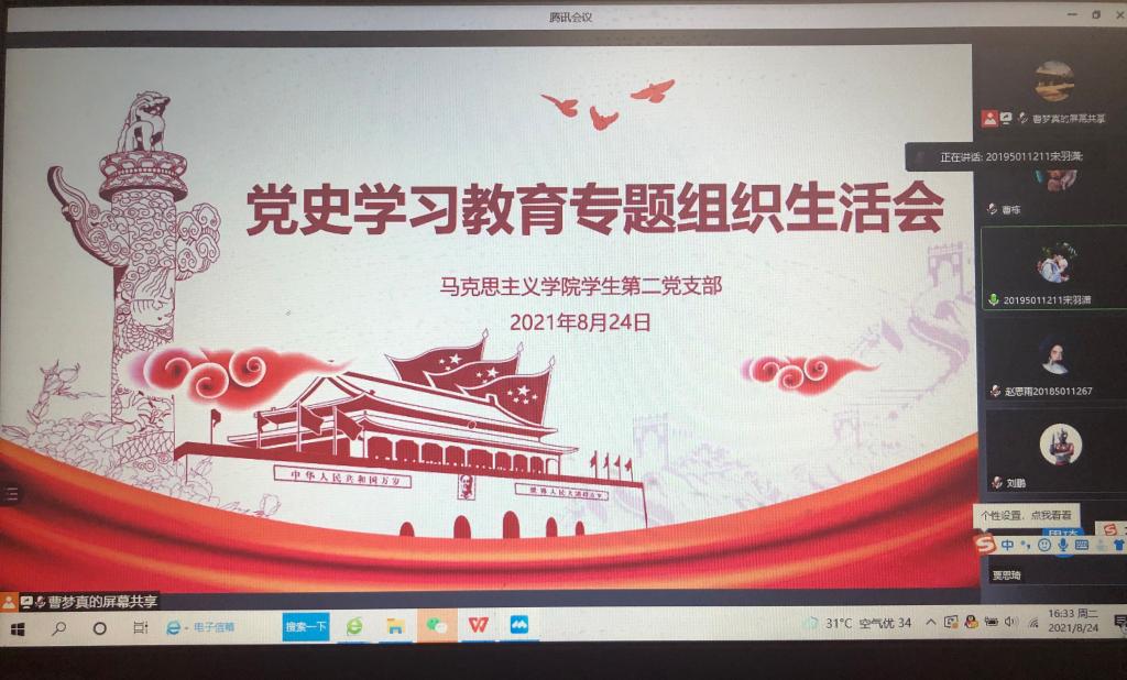 8月24日下午,beat365亚洲版官网学生第二党支部通过腾讯会议,在线上开展了以“学党史、悟思想、办实事、开新局”为主题的党史学习教育专题组织生活会。会议由党支部书记曹梦真主持,beat365亚洲版官网学生第二党支部全体党员共同参加。