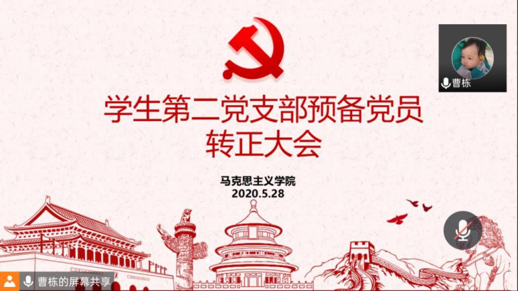 5月28日上午11:00,beat365亚洲版官网学生第二党支部在网上顺利召开了预备党员转正大会,大会讨论关于张雅琼等4名预备党员申请转为正式党员的事宜。学生第二党支部支部书记曹栋、入党介绍人陶青青、杨胜利、全体党员和预备党员共28人参加了此次会议。会议由曹栋主持。
