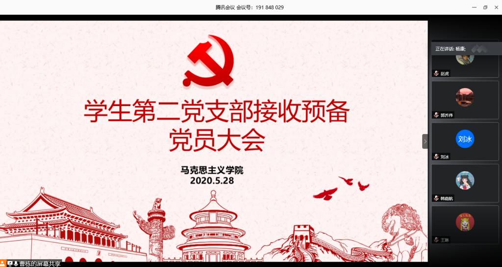 5月28日上午10:00,beat365亚洲版官网学生第二党支部接收预备党员大会通过腾讯会议线上平台顺利举行。beat365官网学生第二党支部支部书记曹栋、入党介绍人陶青青、杨胜利及第二党支部党员、八位接收预备党员共同参加此次会议。会议由曹栋主持。