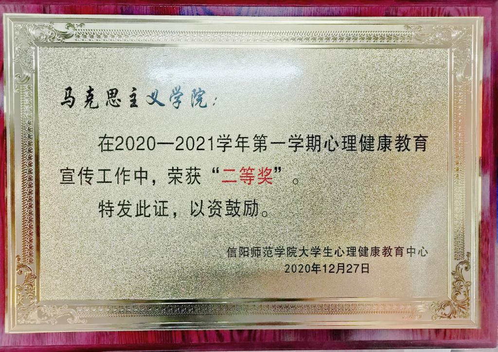 12月29日晚,信阳师范学院大学生心理健康教育中心在逸夫楼报告厅举办“信阳师范学院大学生心理健康教育中心2021年元旦晚会暨年度表彰大会”活动。经评定,beat365官网在第十四届大学生心理健康教育宣传周之心理游园会活动评比中位居第一,在2020-2021学年第一学期心理健康教育宣传工作中,表现突出,荣获“二等奖”,beat365官网学生乔炜林、林兆申、王玮琳被评为“优秀心理工作者”。