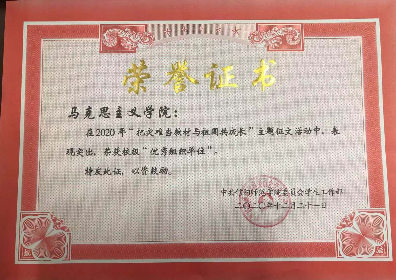 经中共信阳师范学院委员会学生工作部考核审定,beat365官网在学校举办的“把灾难当教材与祖国共成长”主题征文活动中积极参与、表现突出,荣获校级“优秀组织单位”荣誉称号。