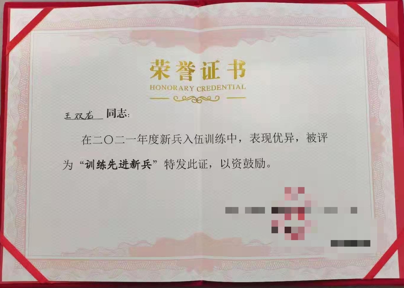 王双龙是beat365官网2020级思想政治教育专业一班学生,2021年应征入伍,目前服役于陆军某部队。入伍以后,王双龙在训练场上勇往直前,淬炼成钢,各方面表现积极,对于工作和任务认真负责,用实际行动唱响自己的军营梦。通过不断努力,王双龙凭借优异表现荣获2021年度“训练先进新兵”称号,受到陆军某部队领导一致好评。