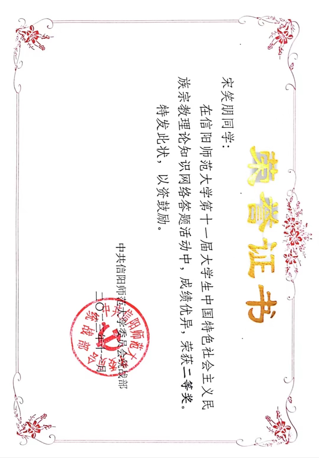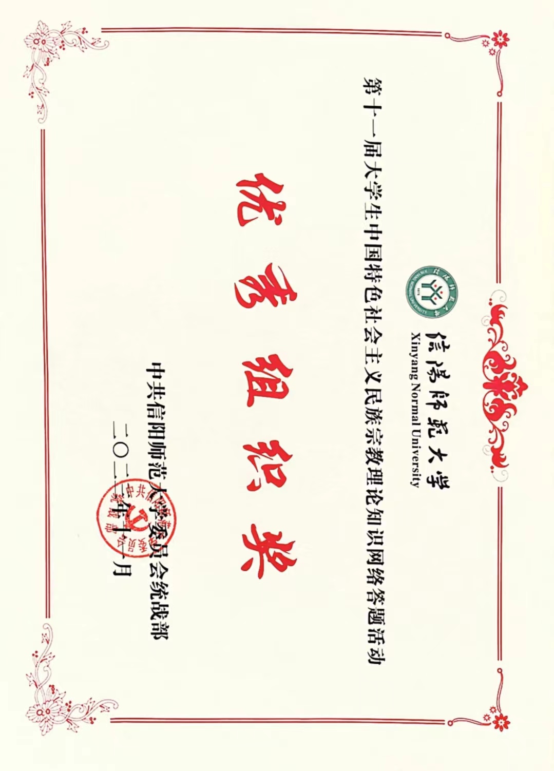 beat365亚洲版官网荣获第十一届大学生中国特色社会主义民族宗教理论知识网络答题活动“优秀组织奖”