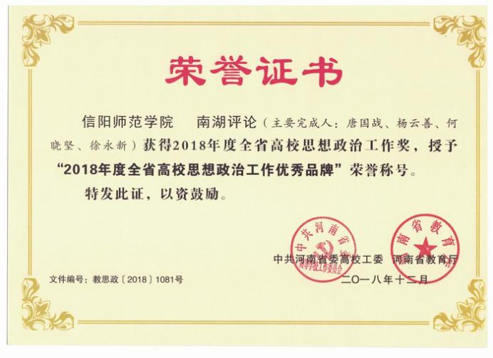 为提高beat365官网学生核心竞争力,增强学生对时政新闻的关注度和思考能力,进一步提高思想政治教育专业学生的表达能力和写作能力,在学院党委领导下,beat365官网创办《南湖评论》刊物,目前已发刊7期,为学生写作提高提供广阔的平台。2018年12月,《南湖评论》获2018年度全省高校思想政治工作优秀品牌。