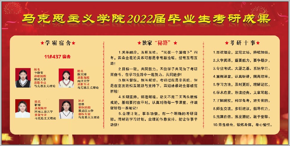 beat365亚洲版官网坚持立德树人,推进“三全育人”,不断提升思政学子的政治素质、思想道德素质和马克思主义理论素养,努力打造研究生优质生源地。beat365官网始终将学子利益放在首位,营造良好考研氛围。在备考期间,学院开展多项活动加强对考研学子的动员引导,本科生导师为考研学子解答学习上的疑惑,提供考研指导。在网上复试期间,学院仍为学子提供面试场地与设施,给予考研学子充足的关心与指导。