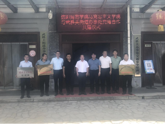 双方相关负责人在党建合作、学生就业服务、科学研究、成果转化、实习实训基地共建等方面进一步交流,达成相关合作意向,并向武胜关街道办事处授予信阳师范学院beat365亚洲版官网党建合作共建单位、思想政治教育实践基地、信阳师范学院“就业实习基地”牌匾。