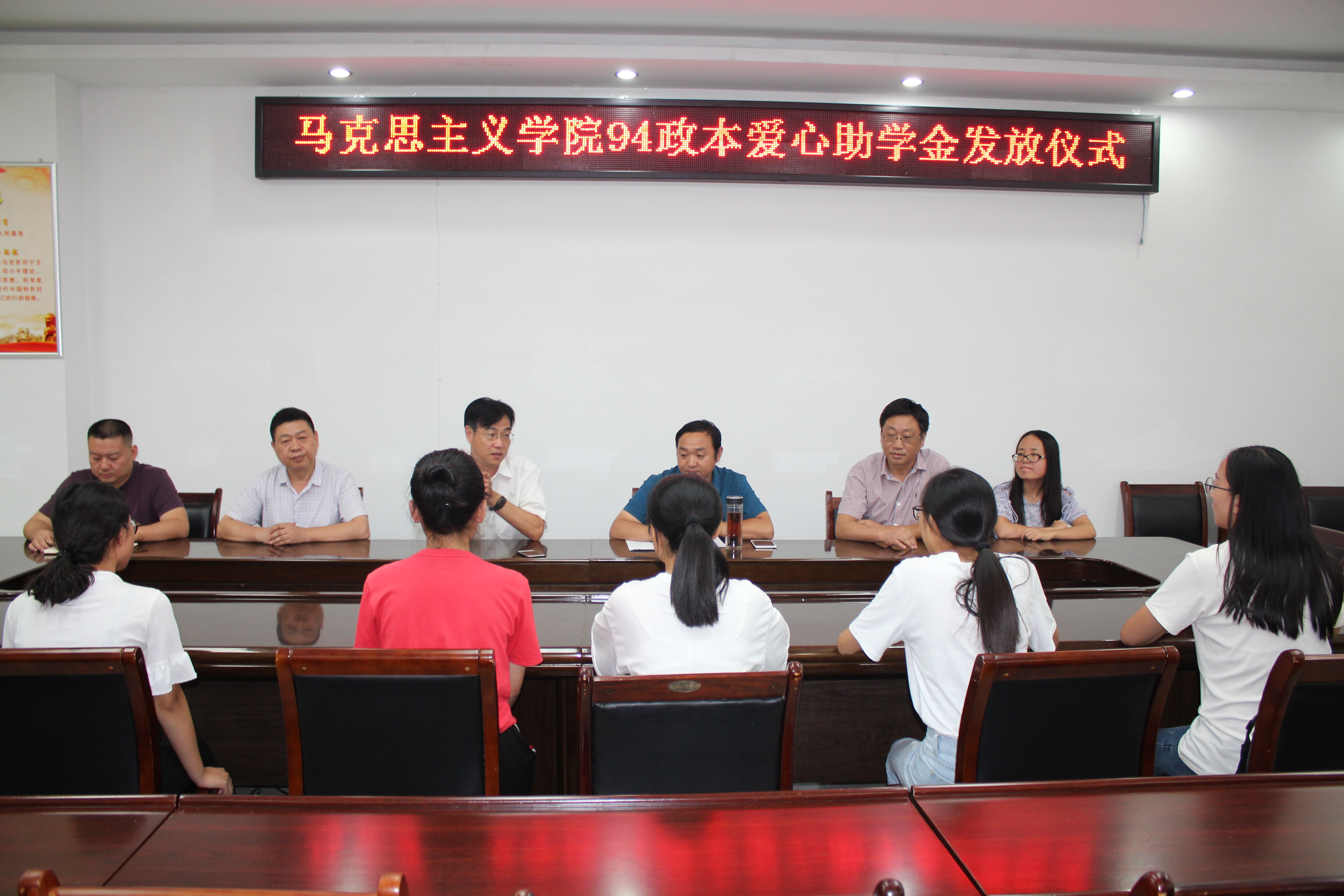 9月7日下午,beat365亚洲版官网于社科楼323会议室举行94政本首批爱心助学金发放仪式。94政本校友代表中共信阳市委党校科研处副处长王瑞,学院副院长周智、程晋富,当代马克思主义研究所副所长门献敏,党委副书记何晓坚,团委老师曹菁菁及首批资助对象六位同学共同参与了本次仪式。仪式由周智主持。