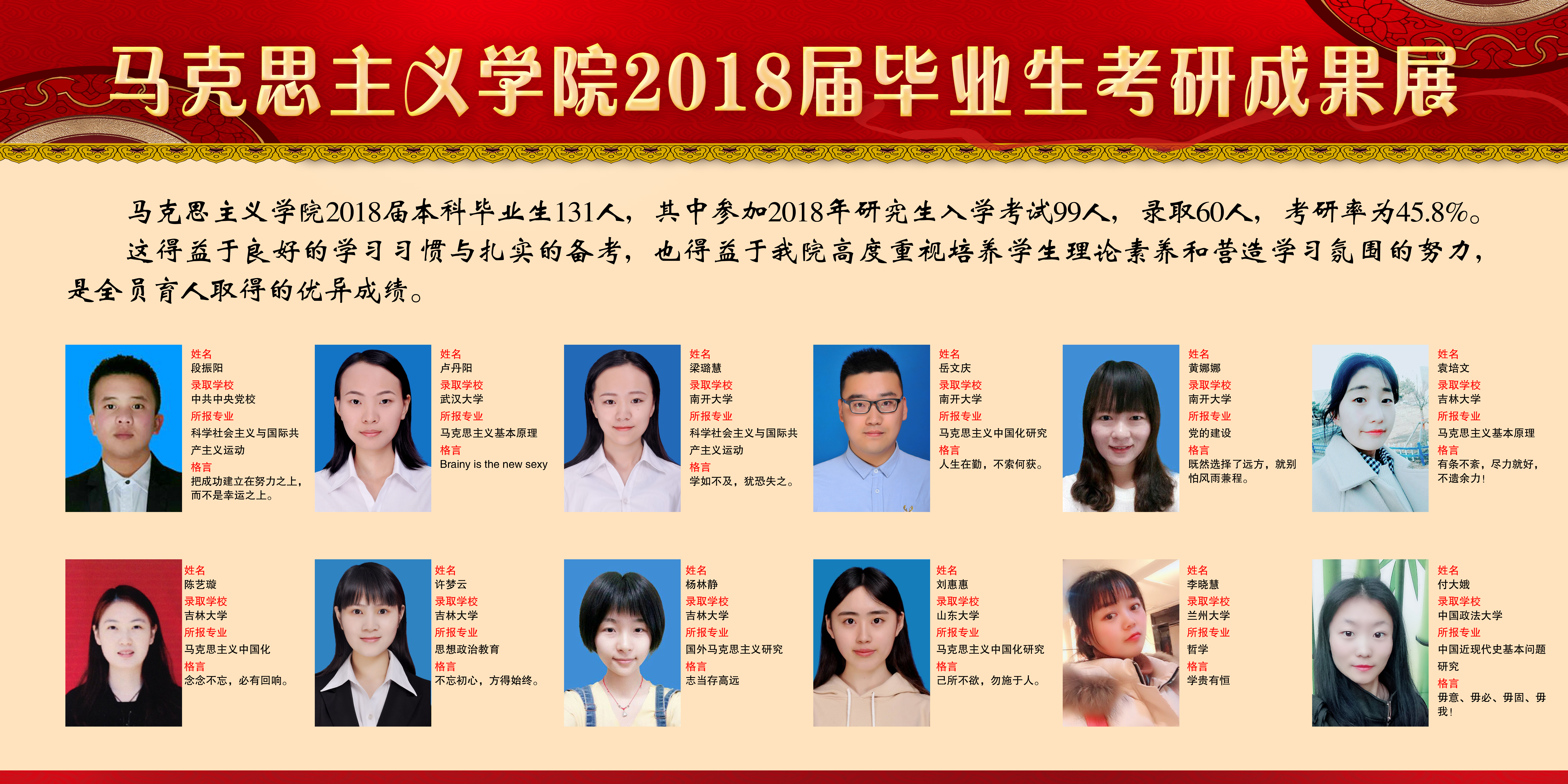 beat365亚洲版官网2018届本科毕业生共131人,参加2018年研究生入学考试99人,成功录取61人,整体考研率为46.6%。