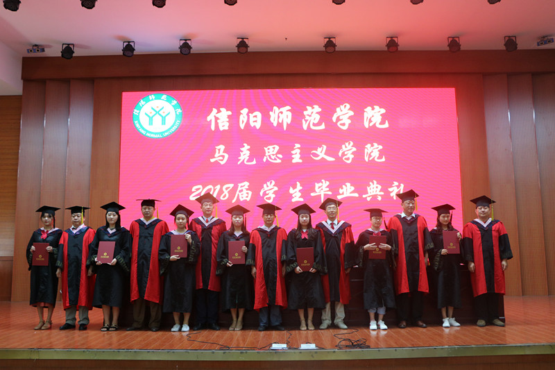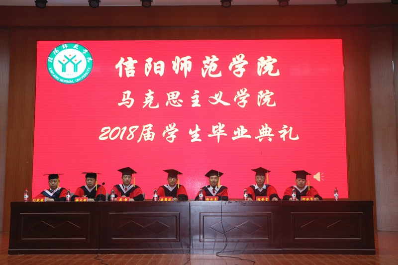 典礼伴随着庄严肃穆的国歌拉开帷幕。程晋富宣读了《信阳师范学院beat365亚洲版官网2018届本科毕业生毕业资格暨学位授予资格审核结果报告》。随后,杨云善致辞,他首先对2018届131名毕业生顺利毕业表示祝贺,对悉心培养、全心育人的教师们表示感谢。对毕业生提出三点要求:一要做执着的追梦者,坚守崇高的理想信念;二要做踏实的践行者,坚守肩上的使命担当;三要有远大的志向,脚踏实地在实践中走向成功。最后,杨云善表达了对全体毕业生的真诚祝福。毕业生代表梁璐慧向母校、学院、教师、同学表达了感激和眷恋之情,表示将不负学院的栽培,坚定学习与践行马克思主义,紧随新时代,争做模范青年。2016级在校生代表张雅琼对学长学姐曾经给予的帮助表示感谢,并为他们送上真挚的毕业祝福。