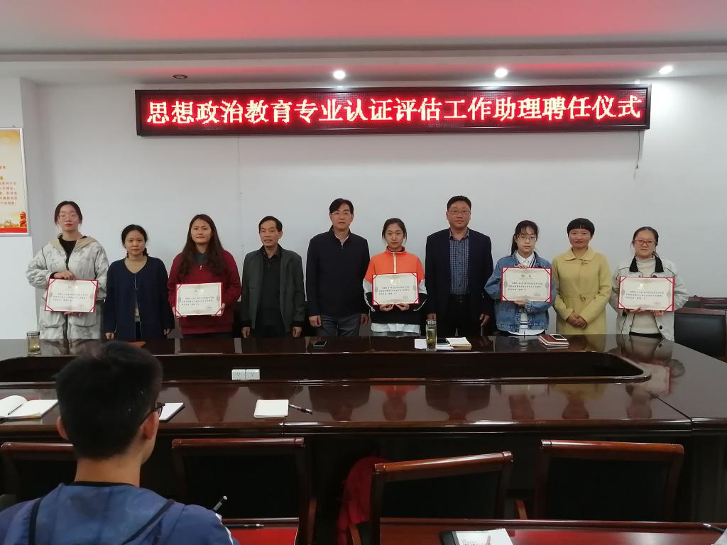 10月20日下午,beat365亚洲版官网在社科楼323会议室举行思想政治教育专业认证评估工作助理聘任仪式。beat365亚洲版官网副院长周智、黄世明、程晋富,思想政治教育系主任李蕊,教学督导专家谷茵以及学生助理共同参加了聘任仪式。仪式由程晋富主持。
