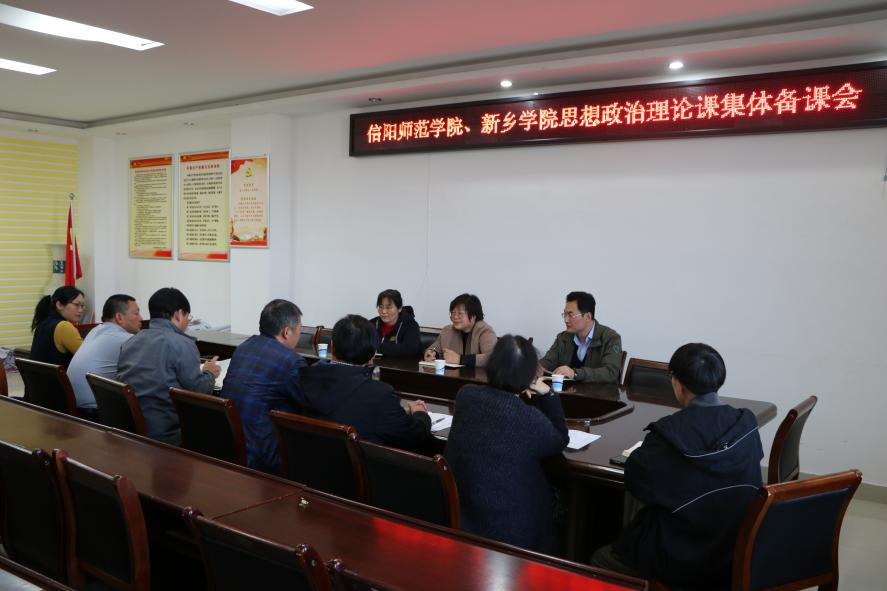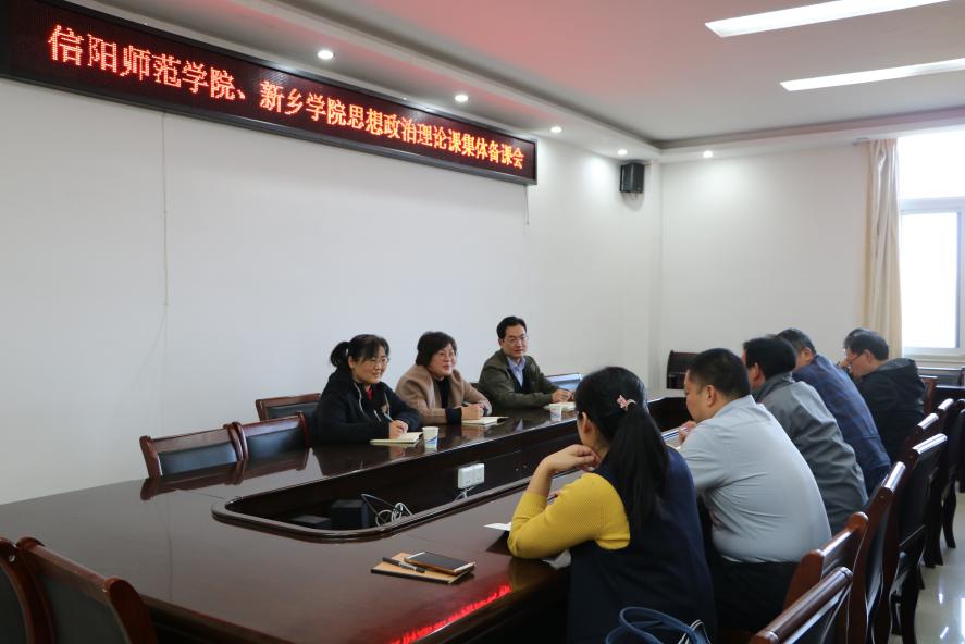 为进一步落实全省beat365亚洲版官网结对帮扶工作,11月10日下午,信阳师范学院和新乡学院《毛泽东思想和中国特色社会主义理论体系概论》《中国近现代史纲要》课程集体备课会在社科楼概论教研室召开。学院副院长周智、当代马克思主义研究所副所长徐永新、学院党委副书记何晓坚、“概论”教研室主任胡春湘,以及两校思想政治理论课教师代表刘新芬、周斌、孙金玲、陈杰、李桂红、王帆宇、曾帝参加备课会。