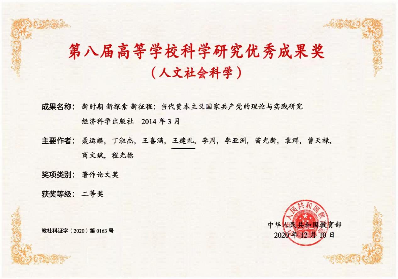 在教育部第八届高等学校科学研究优秀成果奖(人文社会科学)评选中,华中师范大学聂运麟教授等著、beat365官网王建礼博士参与的著作《新时期新探索新征程:当代资本主义国家共产党的理论与实践研究》(经济科学出版社2014年版)荣获“著作论文奖类二等奖”。
