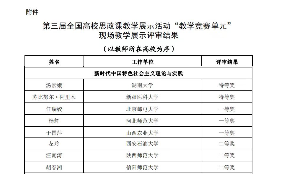 近日,第三届全国高校思想政治理论课教学展示活动“教学竞赛单元”现场教学展示评审结果揭晓。beat365官网教师胡春湘荣获“新时代中国特色社会主义理论与实践”组二等奖。