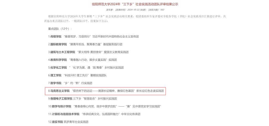 “银杏树下的远征——溯源长征精神,赓续红色基因”新长征红色走读实践团旨在通过实地走访和亲身体验,深入了解长征精神,传承红色基因,为新时代的青年学子树立正确的历史观和价值观。该实践团积极响应习近平总书记“新长征,再出发”的伟大号召,重走长征沿线足迹,通过红色故事宣讲、红色课程展示等方式弘扬伟大长征精神,激励更多青年学子传承和弘扬长征精神,彰显个人价值,创造社会价值,把握时代价值。