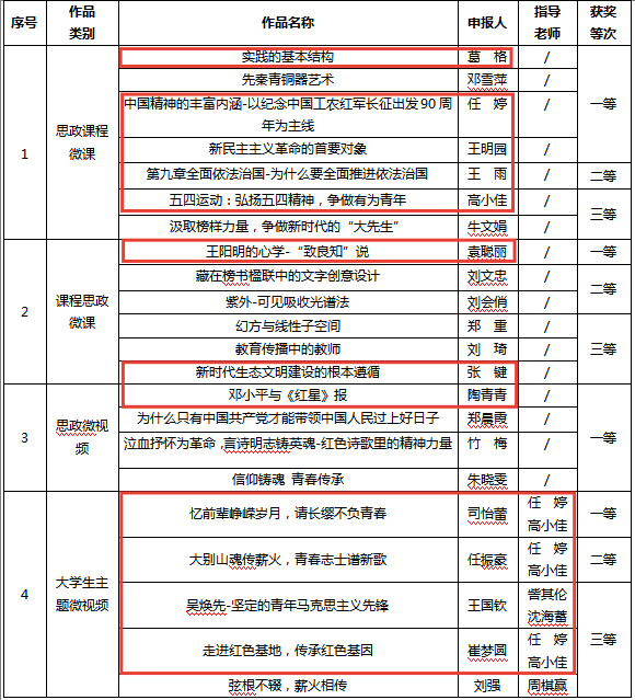 近日,根据《关于开展2024年度河南省大思政微课(微视频)征集活动的通知》要求,河南省社科联、共青团河南省委、河南省高等教育学会、河南省高等学校思想政治理论课教学指导委员会组织专家评委会,对2024年度河南省大思政微课(微视频)征集活动申报作品进行了评选,beat365亚洲版官网12件参赛作品均获奖(框红内)。其中,思政课程微课类作品一等奖3人、二等奖1人、三等奖1人;课程思政微课类作品一等奖1人、三等奖1人;思政微视频类作品一等奖1人;大学生主题微视频类作品一等奖1人、二等奖1人、三等奖2人。