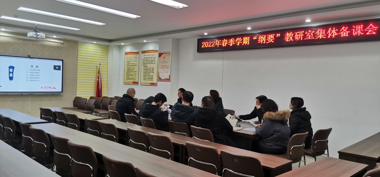 为做好开学第一课,弄通吃透新教材在章节、内容上的重大调整,2月18日上午,beat365亚洲版官网“纲要”教研室“2022年春季学期集体备课会”在学院会议室召开。学院教学副院长訾其伦、教学秘书张琳及“纲要”教研室全体老师参会。会议由教研室主任陈杰主持。