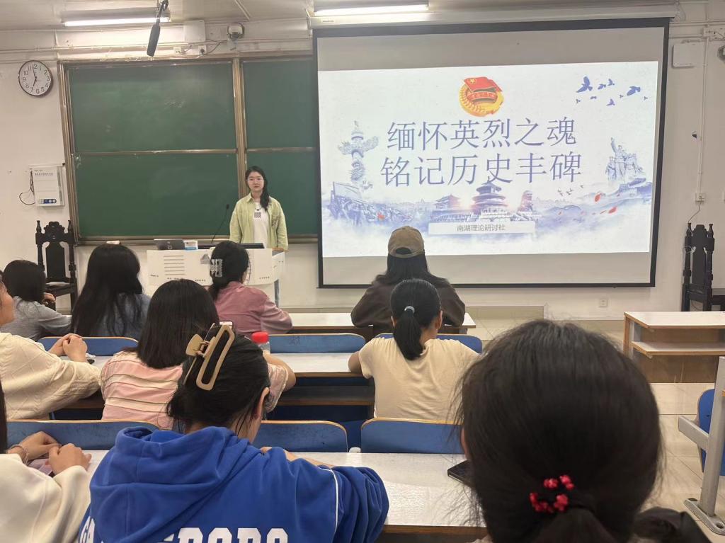 为深切缅怀革命英烈,追忆先烈丰功伟绩,弘扬爱国主义精神,4月1日晚,南湖理论研讨社在社科楼514教室举办 “缅怀英烈之魂,铭记历史丰碑”主题团课活动。团课由团支书助理范茜茜主持,全体社员共同参加。