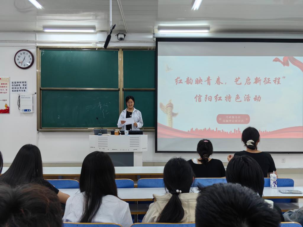 信阳作为鄂豫皖苏区首府所在地,承载着“坚守信念、胸怀全局、团结奋进、勇当前锋”的大别山精神,为引导青年深入理解大别山精神,深化爱国主义教育,4月28日晚上,南湖理论研讨社携考研服务社在社科楼514教室共同举办了“红韵映青春,艺启新征程”信阳红特色活动。