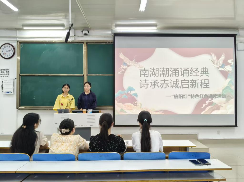 为赓续红色血脉,汲取奋进力量,6月7日下午,南湖理论研讨社于社科楼514教室开展 “南湖潮涌诵经典,诗承赤诚启新程” ——“信阳红” 特色红色诵读活动,以红色诵读厚植家国情怀。
