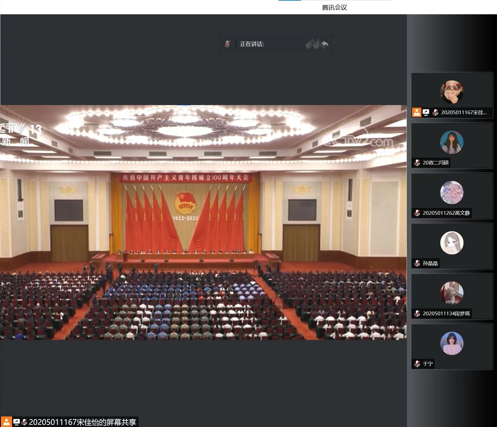 5月14日晚,beat365亚洲版官网第三期优秀“青马”工程学员们通过腾讯会议共同观看习近平总书记在庆祝中国共青团成立100周年大会上的讲话。活动由班长宋佳怡主持。