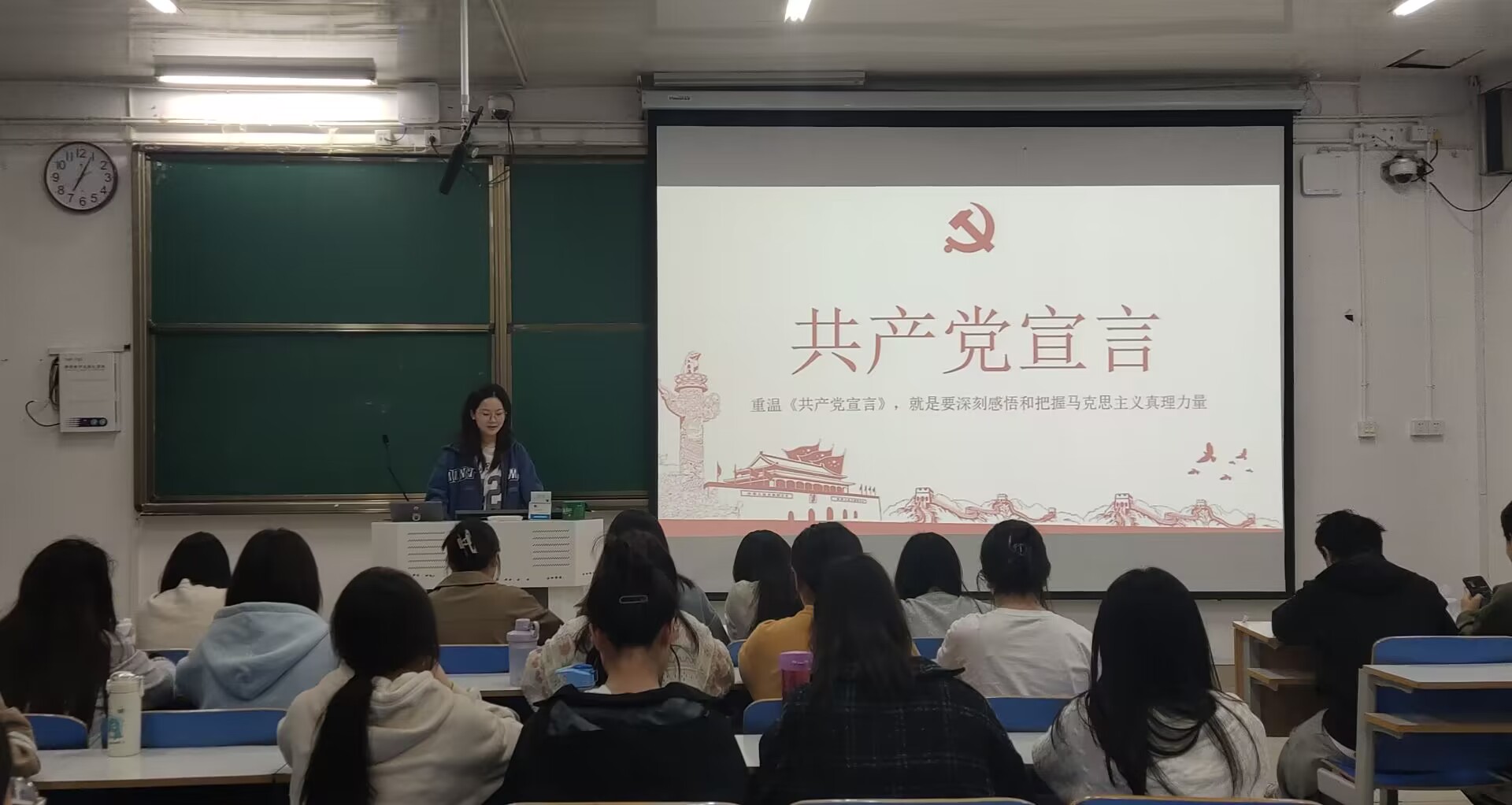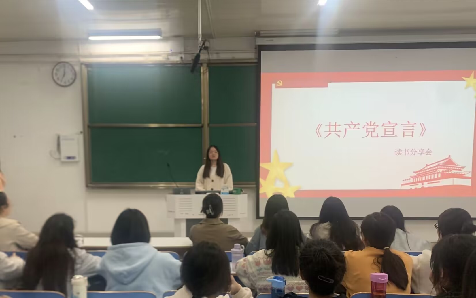 活动伊始,张芝一向大家阐明了阅读是获取知识、启迪智慧的重要源泉,同时指出回归马克思主义经典原著,重温马克思主义经典理论是学员们提升理论功底、增强实践能力的有效途径。随后,邵敏、李佳茹两位学员通过PPT放映和视频播放等方式,依次分享了自己在阅读《共产党宣言》过程中的感悟,同时向大家推荐了《共产党宣言》、《文献中的百年党史》、《红岩》、《中国共产党简史》等书籍。其中,邵敏通过提出“中国共产党取得了革命、建设和改革的伟大胜利,靠的是什么?”的问题抛砖引玉。她谈到,《共产党宣言》是科学社会主义最伟大的纲领性文献,它标志着马克思主义的诞生。这本书培养了一代又一代共产主义战士,改变了中国,也改变了世界。李佳茹从《共产党宣言》产生的时代背景、主要内容、时代意义等三个方面展开。通过分享她阐明了《共产党宣言》是中国共产党人初心和使命的源头,是新时代中国共产党人强大的精神动力。最后,学员们纷纷表示今后一定多读原著悟原理,在学党史中汲取智慧,在强信念中锐意进取,在跟党走中勇担时代责任。
