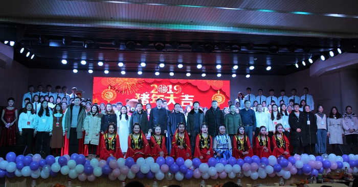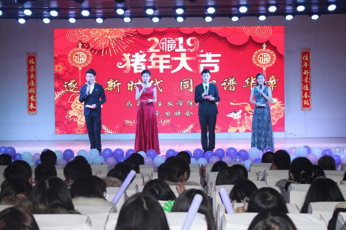晚会开始前,院领导杨云善、唐国战等以VCR视频的形式总结回顾了2018年的工作,向全院师生表达了新年祝福。整场晚会将过去、现在、未来相串联,浪漫柔情与热情动感并存,流行文化与传统民族文化融合。活力满满的开场舞瞬间引爆全场,拉开了此次晚会的帷幕。轮滑表演和rap《友》使民族文化与现代元素激情碰撞,将晚会气氛瞬间点燃。小品《TFgirls》以诙谐的语言和动作引得在场观众捧腹大笑,向我们传达了追逐梦想不惧失败的深层意义。歌曲串烧《歌声飘过四十年》和舞蹈串烧《民族大团结》以悠扬的歌声和曼妙的舞姿,表达出对改革开放四十年的巨大变化的感慨和中华民族各族儿女对实现中国梦的期待。beat365官网党政领导班子与学生代表共同朗诵的《改革开放四十周年颂:中国奇迹》,饱含深情地歌颂出改革开放后中国特色社会主义建设所取得的伟大成就,将对祖国壮丽山河、对明天的希冀融在诗句中,表达出身为中华儿女的骄傲与自豪。整场晚会气氛高涨,高潮迭起,其中穿插的微信抽奖互动环节和“马院锦鲤”的抽选更加丰富了本场晚会的内容。最后,晚会在新时代合唱团的大合唱《在灿烂的阳光下》中落下帷幕。
