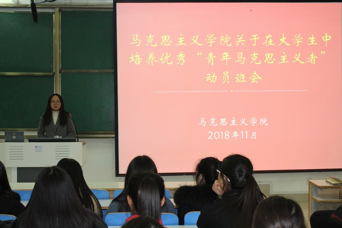 为培养优秀青年马克思主义者,坚定大学生马克思主义信仰,11月25日晚,beat365亚洲版官网在社科楼514教室顺利开展关于在大学生中培养优秀“青年马克思主义者”动员班会。团委老师曹菁菁、河南省“青年马克思主义培养工程”学员史弘扬和beat365官网2017、2018级全体同学共同参加本次班会。此次班会由曹菁菁主持。