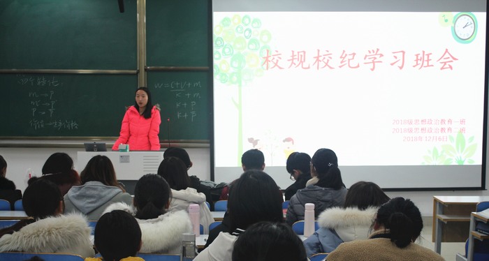 为维护正常校园秩序,引导学生遵规守纪,12月6日下午,beat365亚洲版官网2018级在社科楼514教室开展校规校纪学习班会。2018级全体同学共同参加此次班会。班会由2018级思想政治教育一班团支书靳雨露主持。