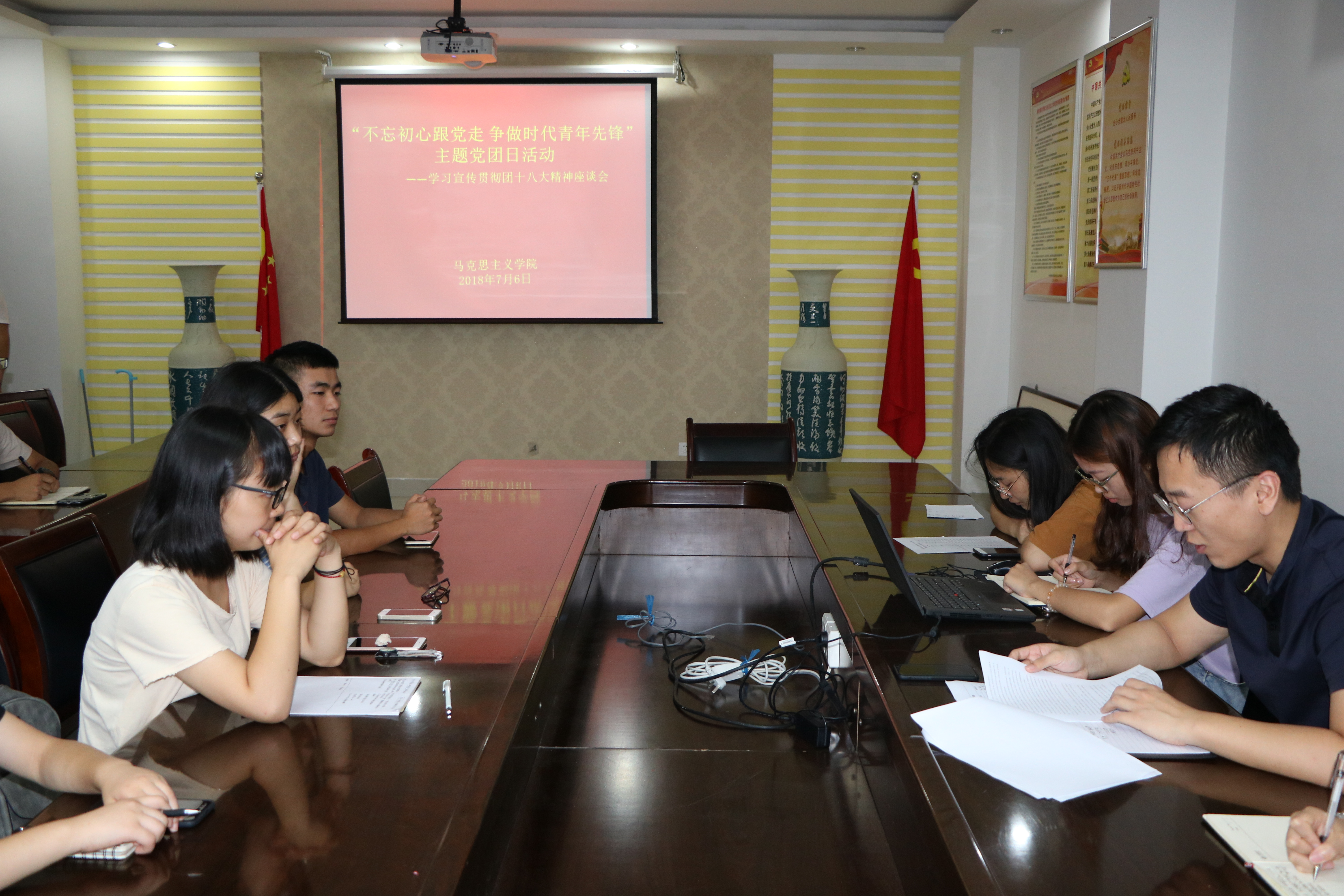 为加强对广大青年团员的教育,学习贯彻习近平新时代中国特色社会主义思想和党的十九大精神,7月6日下午,beat365亚洲版官网于323会议室开展了“不忘初心跟党走,争做时代青年先锋”主题党团日活动,组织团员青年学习座谈中国共产主义青年团第十八次全国代表大会精神。beat365官网团委书记曹栋与20名团员代表共同参加了此次会议。会议由曹栋主持。