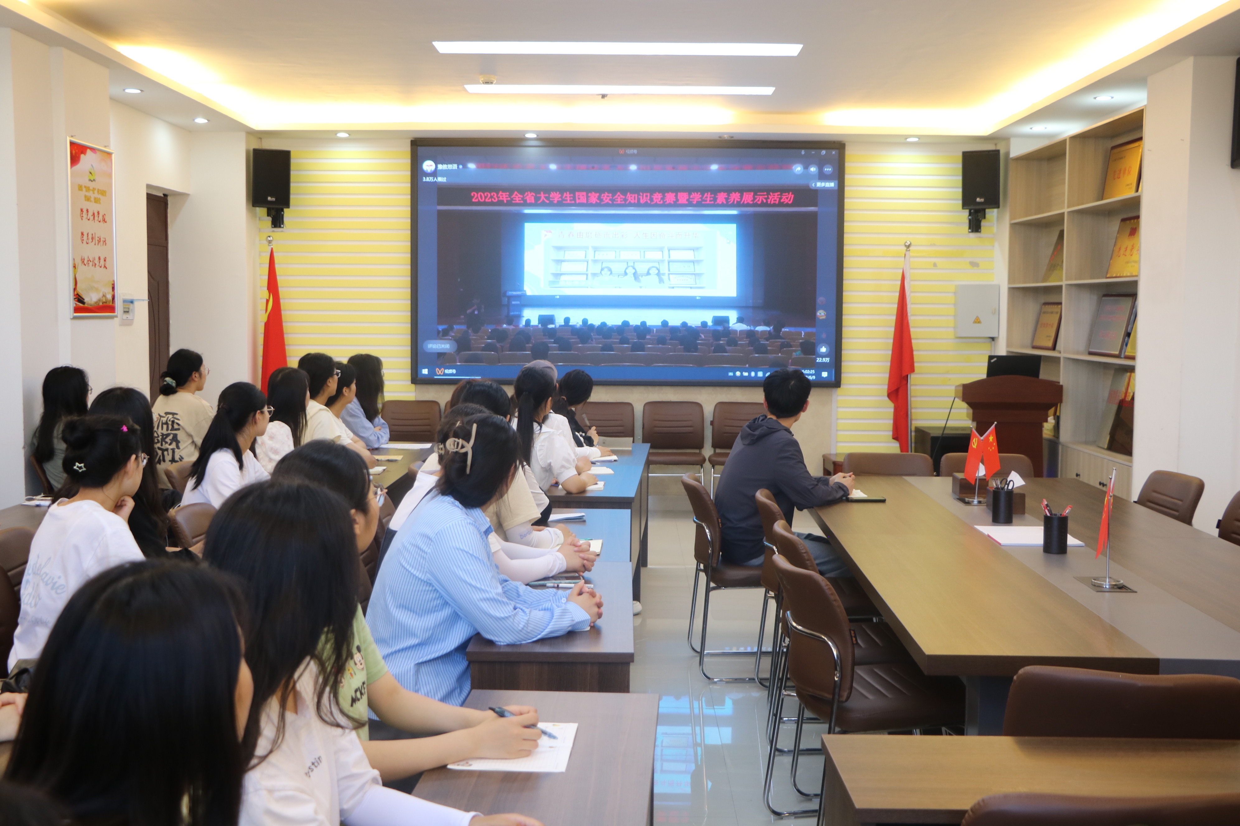 6月9日下午,beat365亚洲版官网在社科楼323会议室组织线上观看“2023 年全省大学生国家安全知识竞赛暨学生素养展示活动现场决赛”。beat365官网专职辅导员沈海蓄、学生会执行主席闫梦辉以及部分学生代表共同观看。