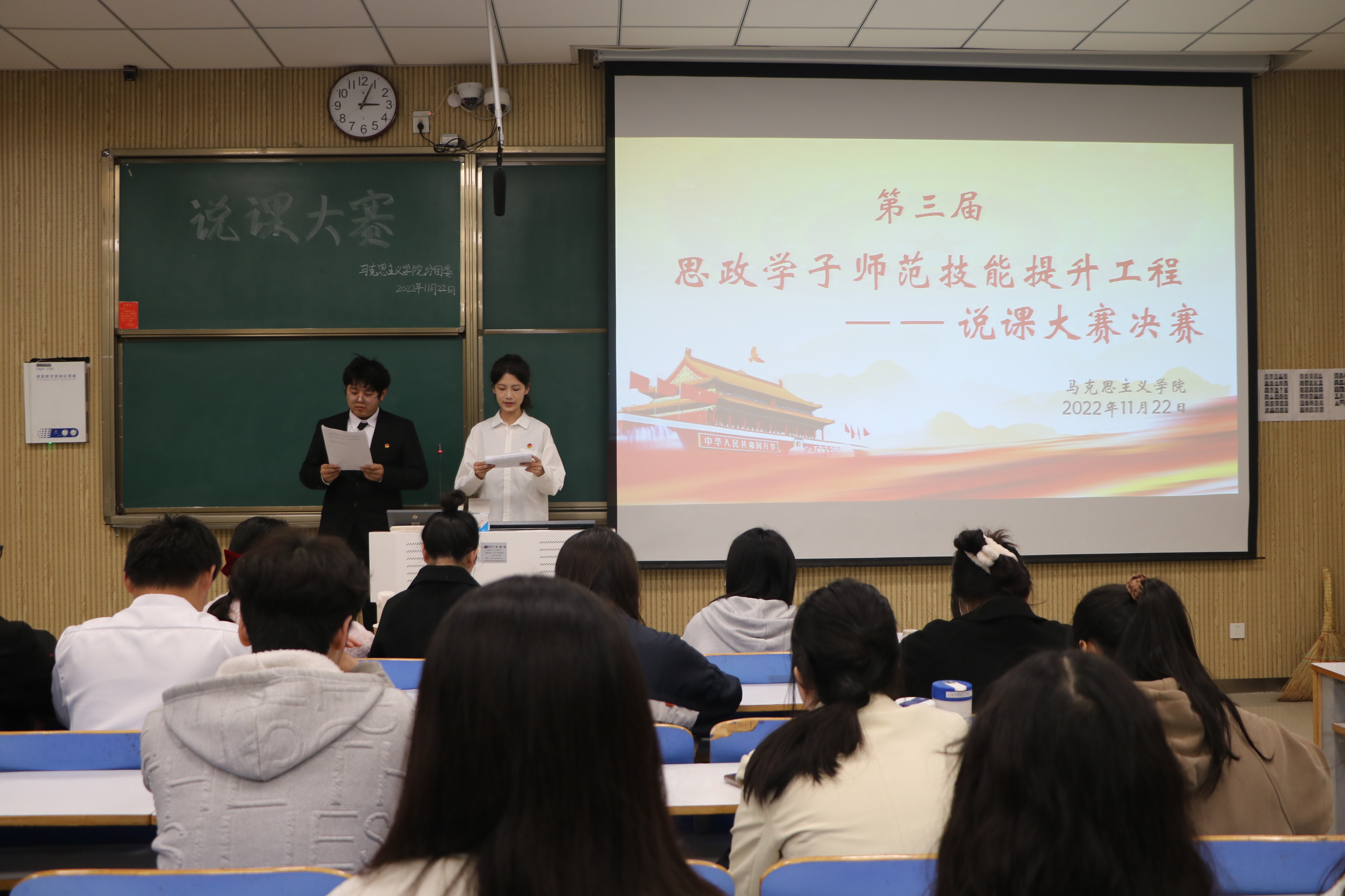为增强师范生课堂创新能力,强化基本功训练,展示师范生课堂教学风采,11月22日下午,由beat365亚洲版官网分团委学生会学术科技部、南湖理论研讨社共同组织的说课大赛决赛在社科楼515教室举办。beat365官网专职组织员任婷、团委老师高小佳和学生会主席团成员共同担任此次比赛的评委。比赛由朱新语、孔德雨主持。