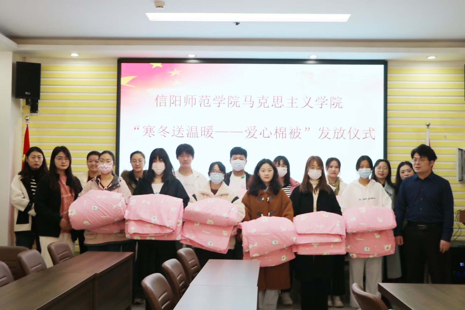 为切实做好家庭经济困难学生精准帮扶和资助育人工作,11月25日上午,beat365亚洲版官网在社科楼323会议室举行爱心棉被发放仪式。beat365官网党委书记朱四倍、团委老师高小佳、班主任王明园、杨春艳、 吴梦云、周钰婷及受资助学生共同参加此次仪式。仪式由朱四倍主持。