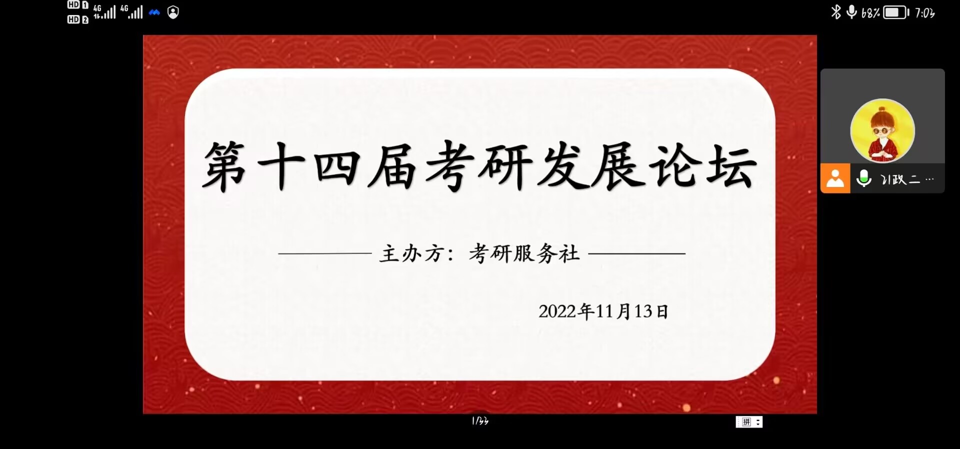 功不唐捐,玉汝于成。11月13日晚上,由beat365亚洲版官网考研服务社组织的第十四届考研发展论坛在线上顺利举行。聚星文登考研指导老师吕明明、校学生会社团部及百名学子共同参加本次论坛。活动由朱钰阁、李雪静主持。