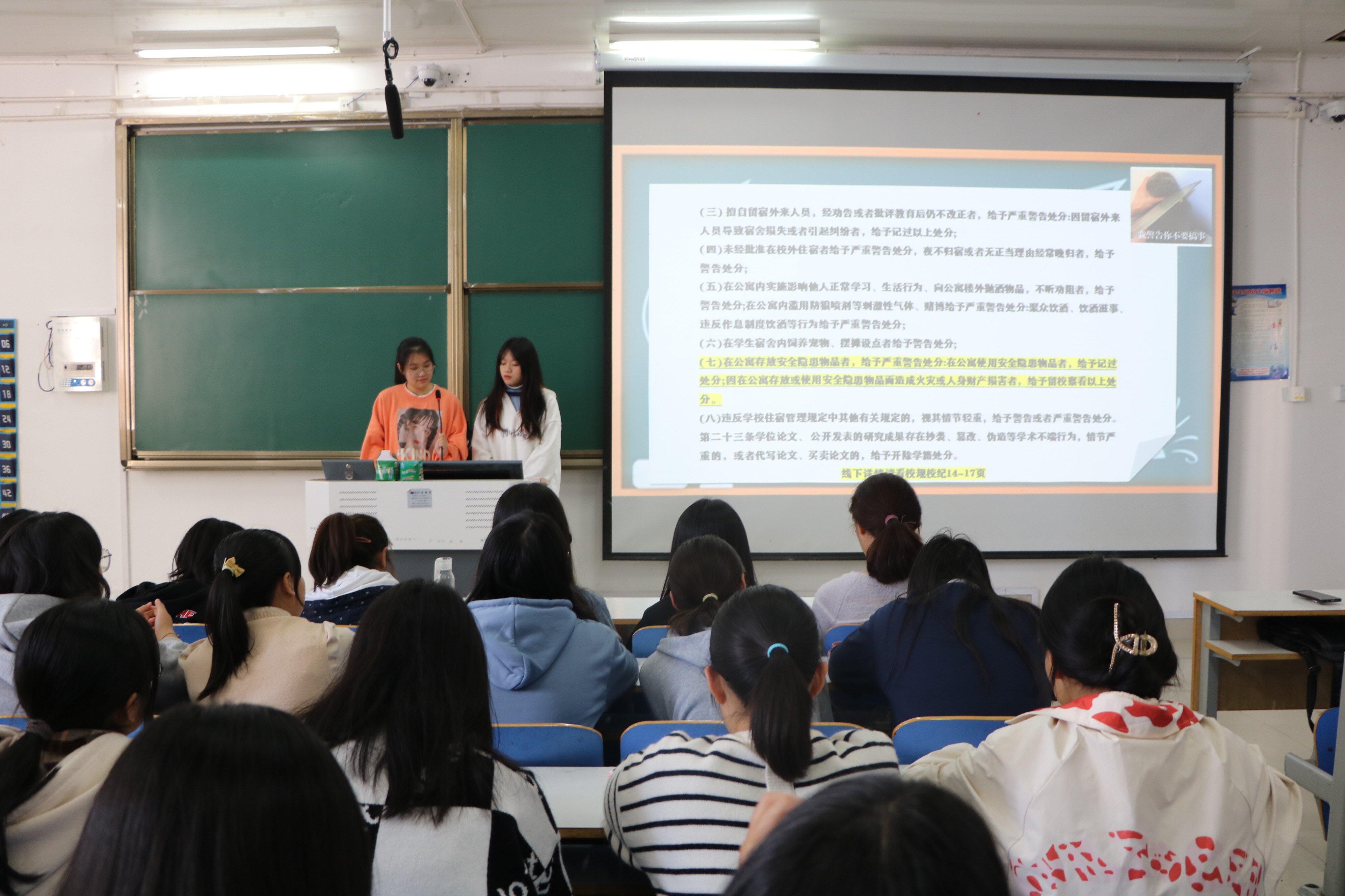 班会内容主要分为交通安全、活动安全、宿舍安全三个部分。首先,王子璇播放宿舍盗窃和宿舍火灾等相关视频,简要介绍了关于安全教育方面的知识,她强调,骑车时不可超载带人,步行时不可低头玩手机,在宿舍禁止使用大功率电器。罗倩结合现阶段宿舍存在的普遍问题,提醒每位新生要严格遵守校规校纪,同时为新生们创造安全、文明的宿舍环境提供了准确有效的建议。随后,王子璇和罗倩带领新生们学习《信阳师范学院学生违纪处分实施办法》相关条例,这对新生明确行为规范、养成良好习惯、培养优良作风有着重要作用。最后,她们提醒新生们要严格执行学校疫情防控管理规定,减少不必要的外出,在人群密集处要佩戴好口罩,做好自我防护。在同学们的积极参与和认真配合下,安全教育主题班会圆满结束。