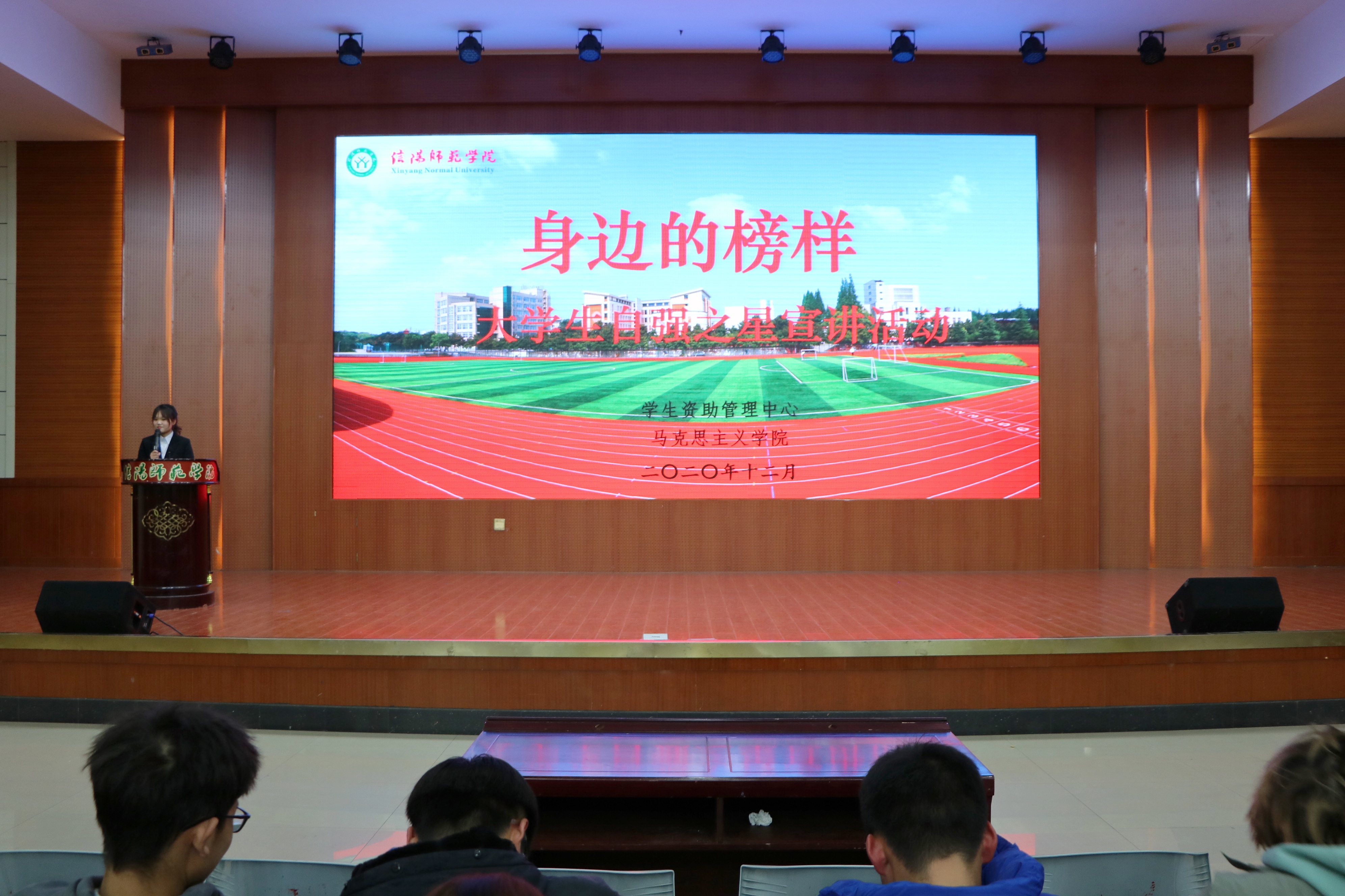为大力推进大学生思想教育工作,彰显榜样力量,激励beat365官网学子艰苦奋斗、顽强拼搏,12月16日晚,由beat365亚洲版官网主办的“身边的榜样”大学生宣讲活动在逸夫楼报告厅举办。beat365官网团委老师曹菁菁、数学与统计学院贾晴岚、体育学院王梦卓、音乐与舞蹈学院许美佳以及beat365官网2019级、2020级全体学生共同参加此次活动。活动由曹菁菁主持。